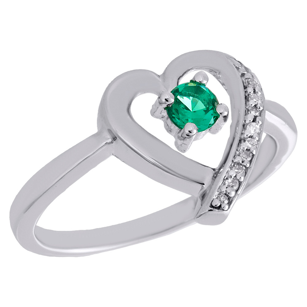 This beautiful white diamond and lab created green emerald ring is new additions to our diamond ring collection. Crafted in .925 sterling silver, this exquisite design features a lab created green emerald in the center of an open heart design with a row of white diamonds on the outline of the heart. The ring showcases a heart with a row of diamonds. Radiant with 0.03 ct. total weight of diamonds and polished to a bright shine, the diamonds are in pave setting for a firm and secure hold. All the diamonds on this ring are of equivalent color and clarity, giving this ring a comparable shine and luster throughout.