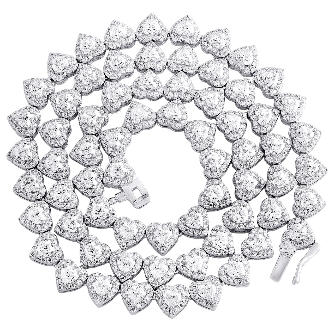 New to our Rodeo Jewelers collection is this classic Heart Tennis Necklace / Chain with Moissanites. Crafted in solid 925 Sterling Silver, this chain has a well built frame to withstand daily wear and tear. These are all Round cut Moissanites in Prong setting close together, making the overall appearance larger and lustrous. The Moissanite are of matching quality throughout. Radiant with 30.58 ct. t.w. of Moissanites, this necklace is polished to a lustrous bright shine. This Tennis necklace is 20" long, 7.5mm wide and weighs approx. 31 gr.. Seamless Box clasp closure ensures your chain is secured in style. This 1 Row Choker necklace will make a great addition to your jewelry collection. If you are looking for a different length, please contact us and we can try to accommodate your request.