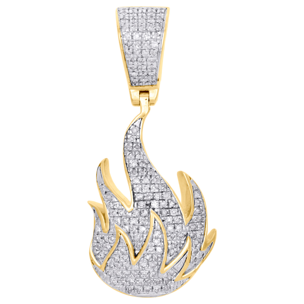 This eye-catching genuine diamond Fire Emoji pendant is crafted in 10k yellow gold and shimmering white diamonds, ensuring sparkle from every angle. Radiant with 0.40 ct. t.w. of genuine diamonds, this pendant is high-polished to lustrous shine. Exclusive style has well built frame, with caged back to withstand everyday wear and tear. The diamonds are securely held in a pave setting, making the overall appearance larger and lustrous. Matching diamond bale to complete the exclusive style. These are all 100% genuine brilliant round cut diamonds. All the diamonds are of same clarity and color throughout. Mini size unisex pendant. This pendant is 4 grams and 1.40 inches in length. This will be a great addition to your growing jewelry collection.