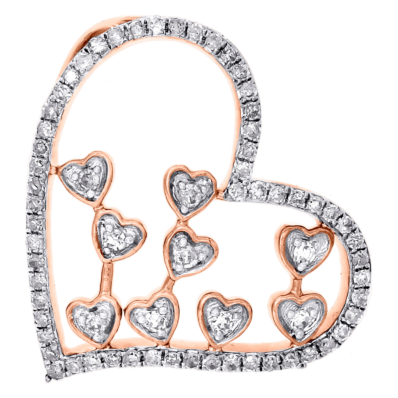 This eye-catching multi-heart shaped outline diamond pendant is crafted in solid10K rose gold and shimmering white diamonds, ensuring sparkle from every angle. Radiant with 1/3 ct. t.w. of genuine diamonds, this pendant is high polished to a bright shine. Exclusive style has a well built frame to withstand everyday wear and tear. The diamonds are securely held between the gold mounting in a pave setting close together, making the overall appearance larger and lustrous. Sidways Heart frame gives this slide pendant a exclusive look. These are all 100% genuine round diamonds. All the diamonds are of same clarity and color throughout. This women's pendant is 0.80 inches in length and weighs approx. 1.9 grams. This one of a kind piece would make a perfect addition to your jewelry collection.