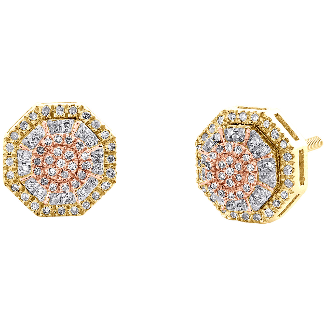 10K Tri-Color Gold Genuine Diamond 8mm Geometric Octagon Stud Earrings 0.15 CT