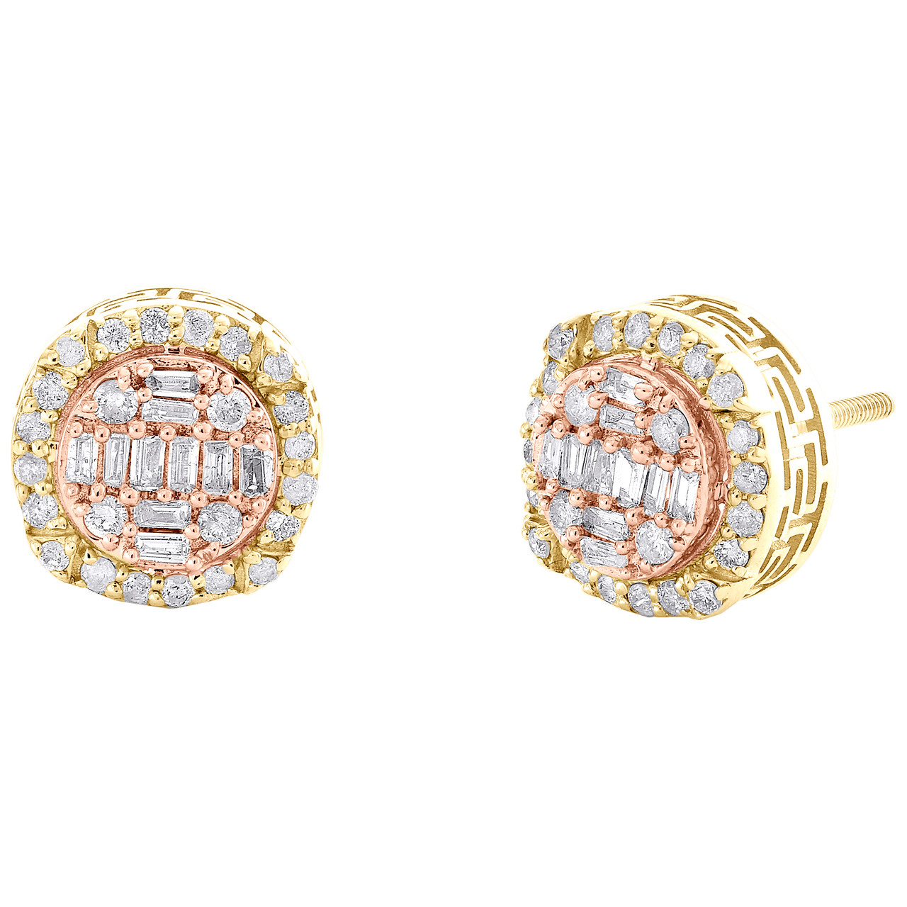 Stunning pair of studs added to our Rodeo Jewelers earring collection. These earrings are crafted in solid 10k Multi-Tone Gold. Radiant with 0.52 ct. t.w. of genuine diamonds, these studs are high polished for a lustrous shine. These particular studs consist of genuine Baguette & Round White diamonds in Prong Setting, making the overall appearance larger and lustrous. Screw Backs for secure wear, these earrings will make a great gift for any occasion. Tiered Round Halo give these earrings depth and makes a bold fashion statement. Good size, these studs are 10.25mm wide and 5.75mm in thickness. These diamond studs / earrings weigh approx. 3 gr.