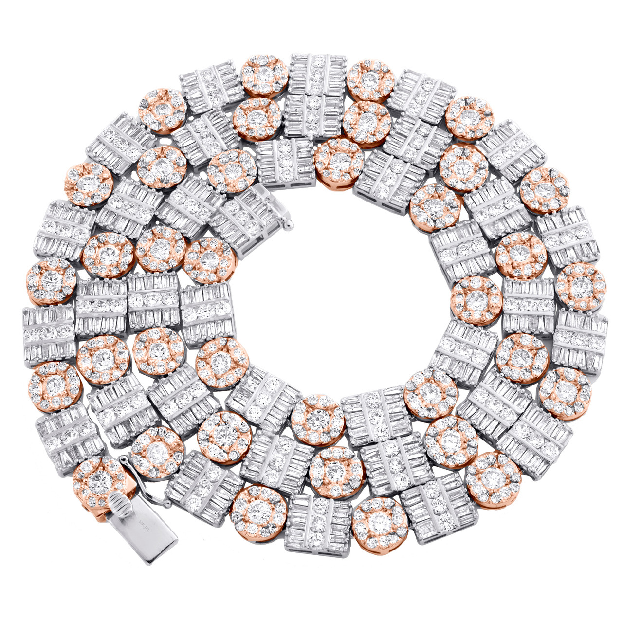 (36.6 gr. of 10K White & Rose Gold | Total Carat Weight: 20.75 ct. t.w. of White Diamonds | Length: 22" | Width: 7mm | Clarity: SI2 - I1 | Color: G - H | Men's Genuine Round and Baguette Cut Diamond Cluster Fancy Chain Statement Necklace)