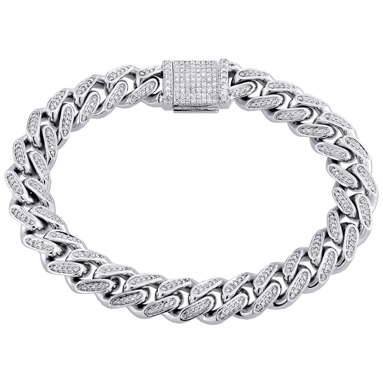 A new sophisticated and elegant look added to our Diamond Bracelet collection is this Solid Miami Cuban Link genuine diamond bracelet. Casted in solid 10K White Gold and natural diamonds. Sturdy frame for durability and comfort fitting. All round cut diamonds are in prong / pave setting, making the overall appearance larger and lustrous. This statement piece will make a great addition to your jewelry collection. All the diamonds in this bracelet are of equivalent color and clarity, giving this bracelet a comparable shine and luster throughout. This bracelet has a Custom Diamond Box Clasp for secure wear. This bracelet is 11.85mm wide. and weighs approx. 88.4 grams of gold.