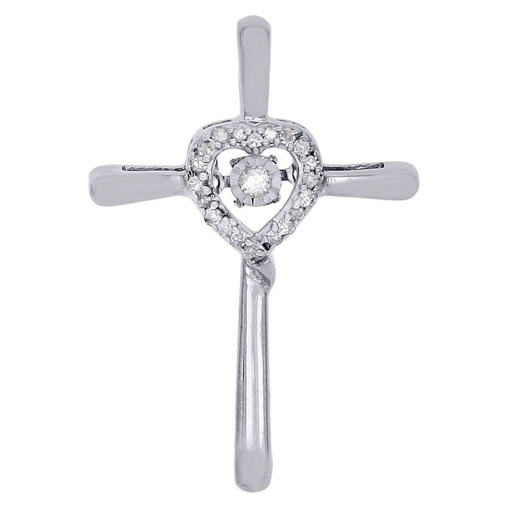 Rodeo Jewelers brings you this beautiful Cross Heart fashioned pendant. Simple yet striking, this white dancing diamond cross with a heart pendant is a great look with any attire. Created in 10k white gold. This cross pendant has round diamonds in shared prong setting close together for a brilliant shine. Radiant with 0.10 ct. total diamond weight. This pendant is 1.05" long and would make a perfect gift for any occasion.