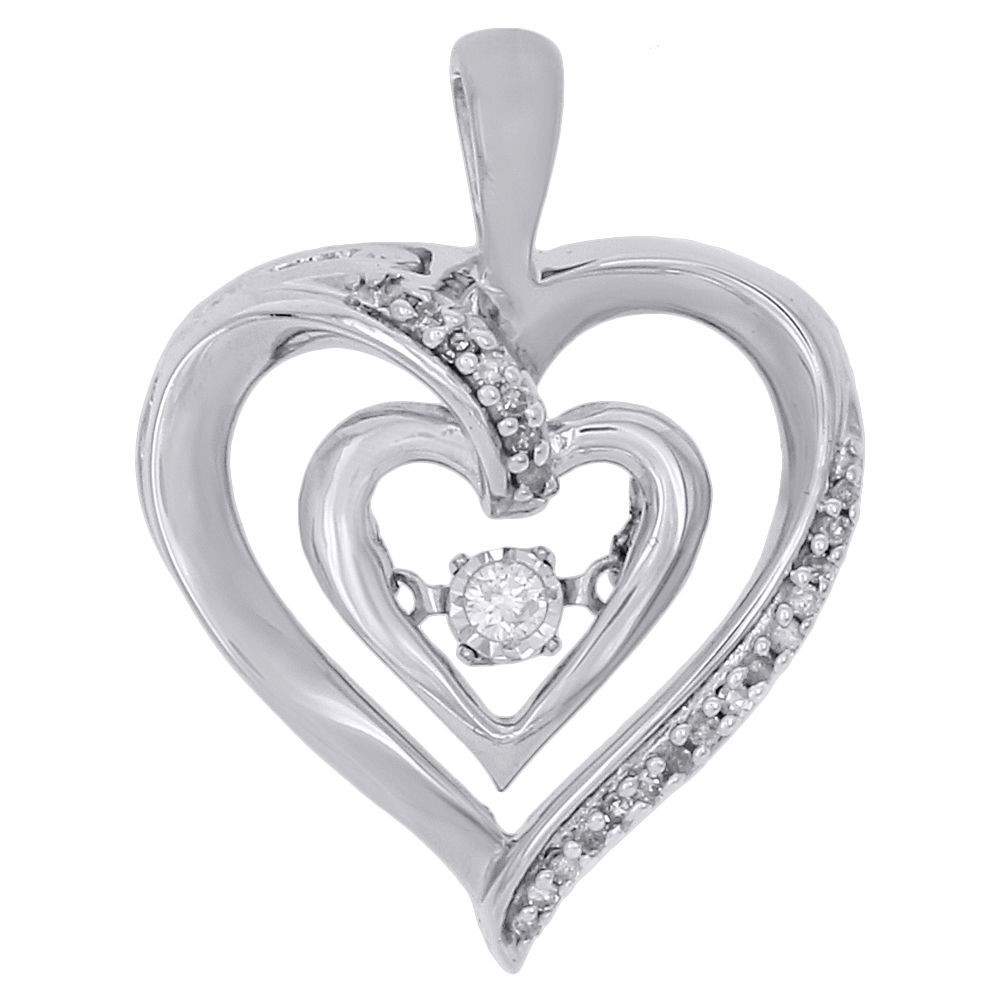 Rodeo Jewelers brings you this beautiful dancing diamond heart fashioned pendant. Simple yet striking, this white diamond pendant is a great look with any attire. Crafted in 10k white gold, this statement pendant is high polished to a bright shine. This heart pendant has round diamonds in shared prong setting close together for a brilliant shine. Radiant with 0.10 ct. total diamond weight.