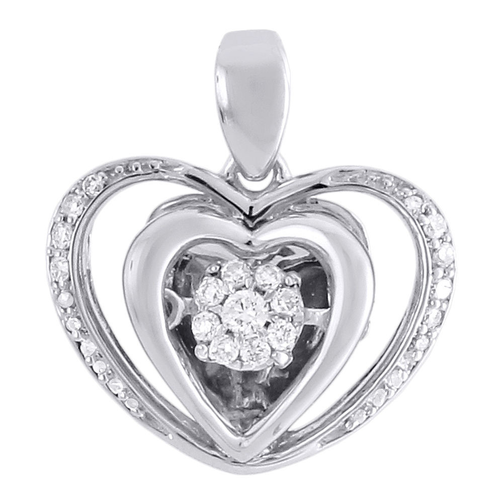 Rodeo Jewelers brings to you this beautiful 10K White Gold diamond double heart fashion pendant . It features a sparkling dancing diamond at its center. Dancing diamond features a sparking diamonds that pivots within its frame, which creates the effect of constant motion and sparkles as you wear them. This pendant is 100% real natural diamonds and gold. The center prong setting is holding a cluster of round diamonds.