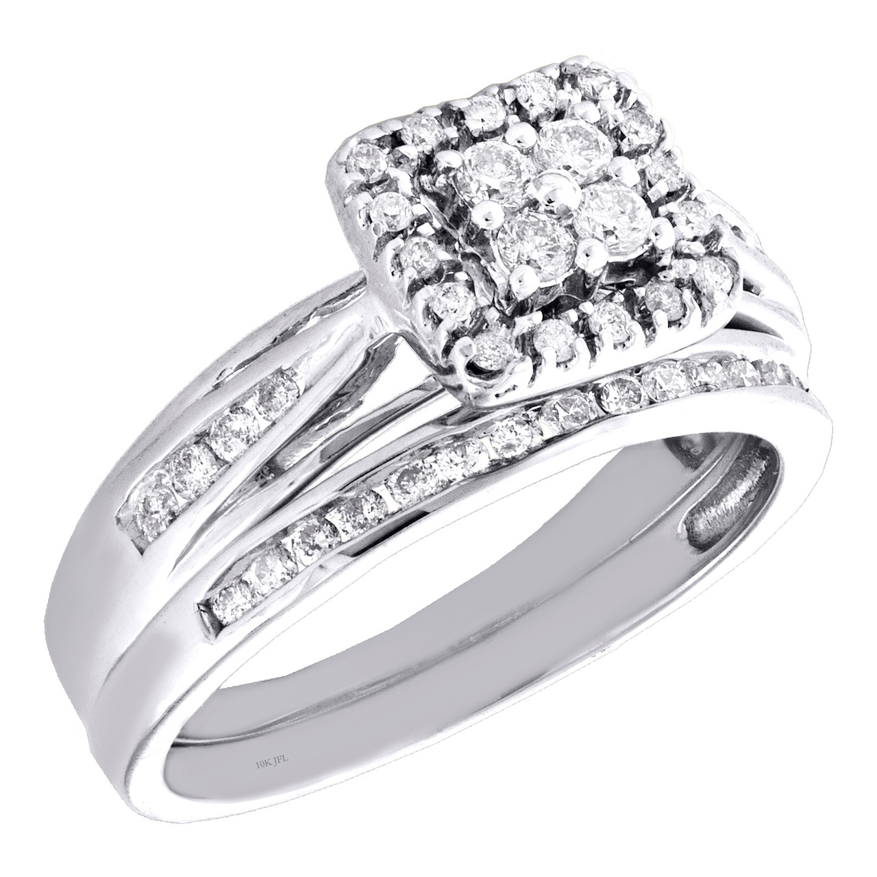 10K White Gold Diamond Bridal Set Square Halo Engagement Ring + Band Set 1/2 Ct.