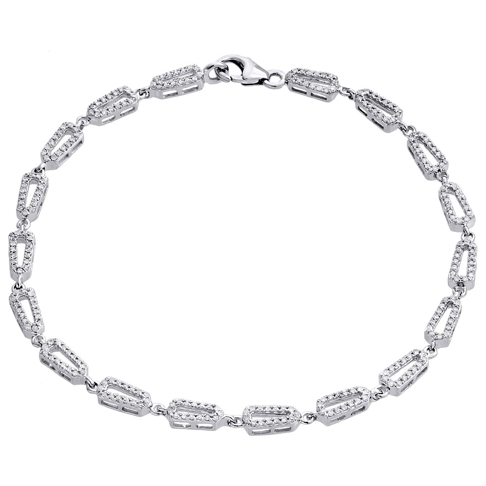 A new sophisticated and ?classy style, this ?fancy frame statement bracelet ?has just a hint of subtle sparkle?. ?Crafted in solid 10K White ?Gol??d with? shimmering round diamond, a gift she will always treasures. Clever design pairs gracefully with round cut diamonds, a look that captures the eye. The round cut diamonds are set in pave setting, making the overall appearance larger and lustrous. Radiant with ?3/4 ct. t.w. of genuine diamonds and high polished to a bright lustrous finish. All the diamonds in this bracelet are of equivalent color and clarity, giving this bracelet a comparable shine and luster throughout.? This trendy bracelet weighs 5.3 gr. and measures 7.50 inches long and 3.75mm wide.