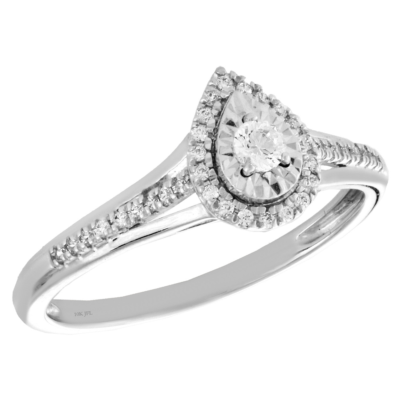 This exquisite diamond engagement ring, fashioned in 10K White Gold. This ring showcases a Miracle Set Teardrop Center. A teardrop halo frame of smaller accent round diamonds surrounds the center, while additional accent diamonds line the ring's shank in shared prong setting in a Split Shank design. A look she'll treasure forever, this engagement ring captivates with 0.20 ct. t.w. of diamonds and polished to a bright shine. The diamonds are machine set precisely to give it a smooth uniform flow. Solid mounting, the ring weighs approx. 1.7 grams of gold. All diamonds in this ring are matching in clarity & color.