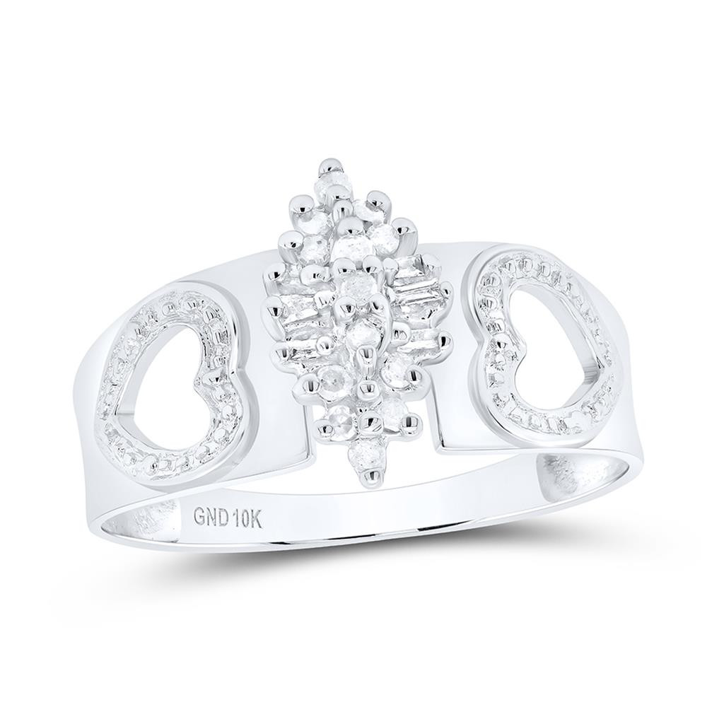 - 10K White Gold Diamond Womens Double Heart Marquise Cluster Cocktail Ring 1/8 CT