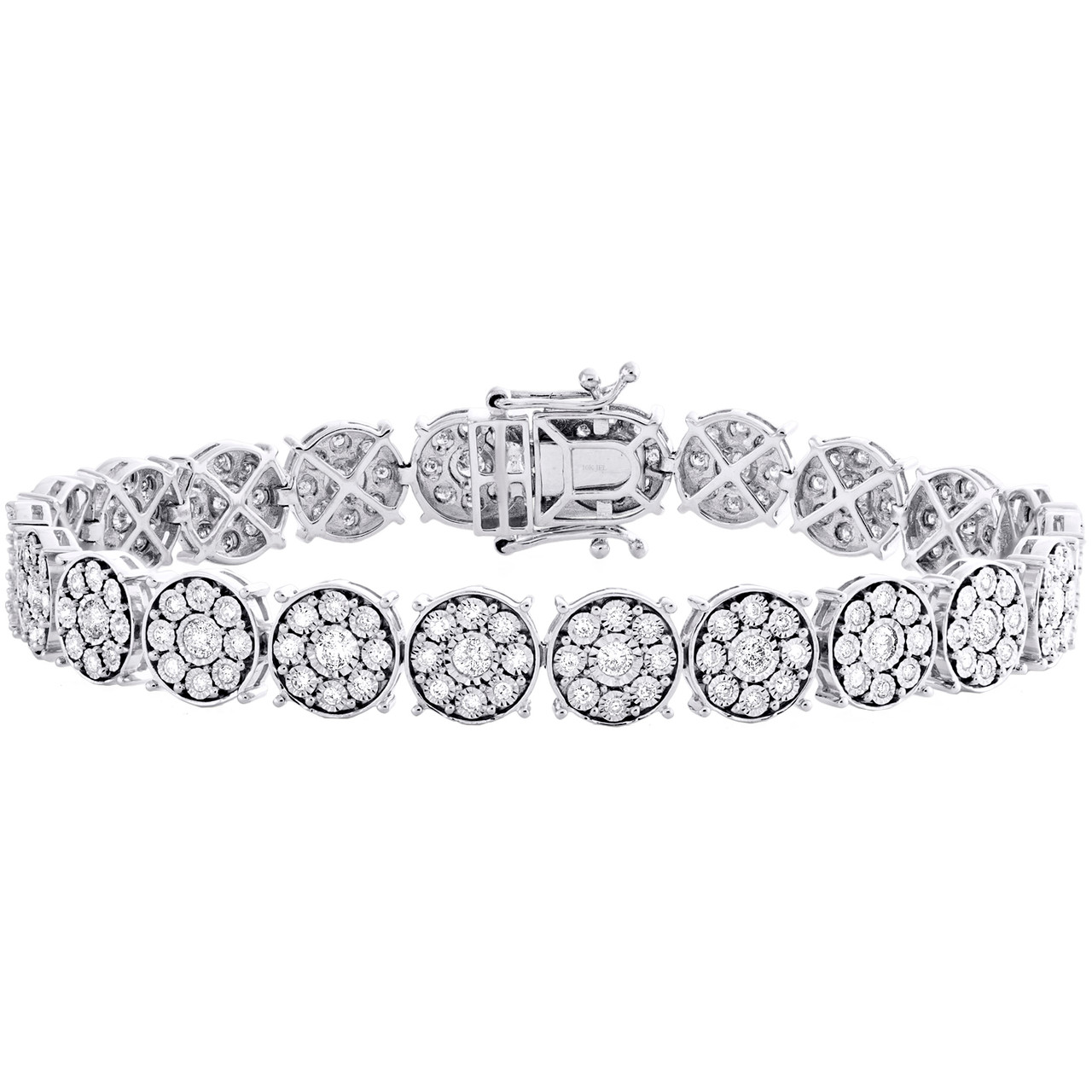 A new sophisticated and elegant look. Crafted in solid 10k White Gold, this Round / Circle Link Statement bracelet is adorned with genuine White diamonds. The diamonds are securely held between the gold mounting in Miracle setting, making the overall appearance larger and lustrous. A meaningful look you'll treasure forever. Radiant with 2 ct. t.w. of genuine Round diamonds and polished to a lustrous shine. This bracelet would make a great addition to your jewelry collection. All the Diamonds in this bracelet are of equivalent color and clarity, giving this bracelet a comparable shine and luster throughout. This bracelet is secured with Box Clasp with safety latch. Fits up-to 7" wrist size, 8 mm wide mounting and weighs 13.9 gr.