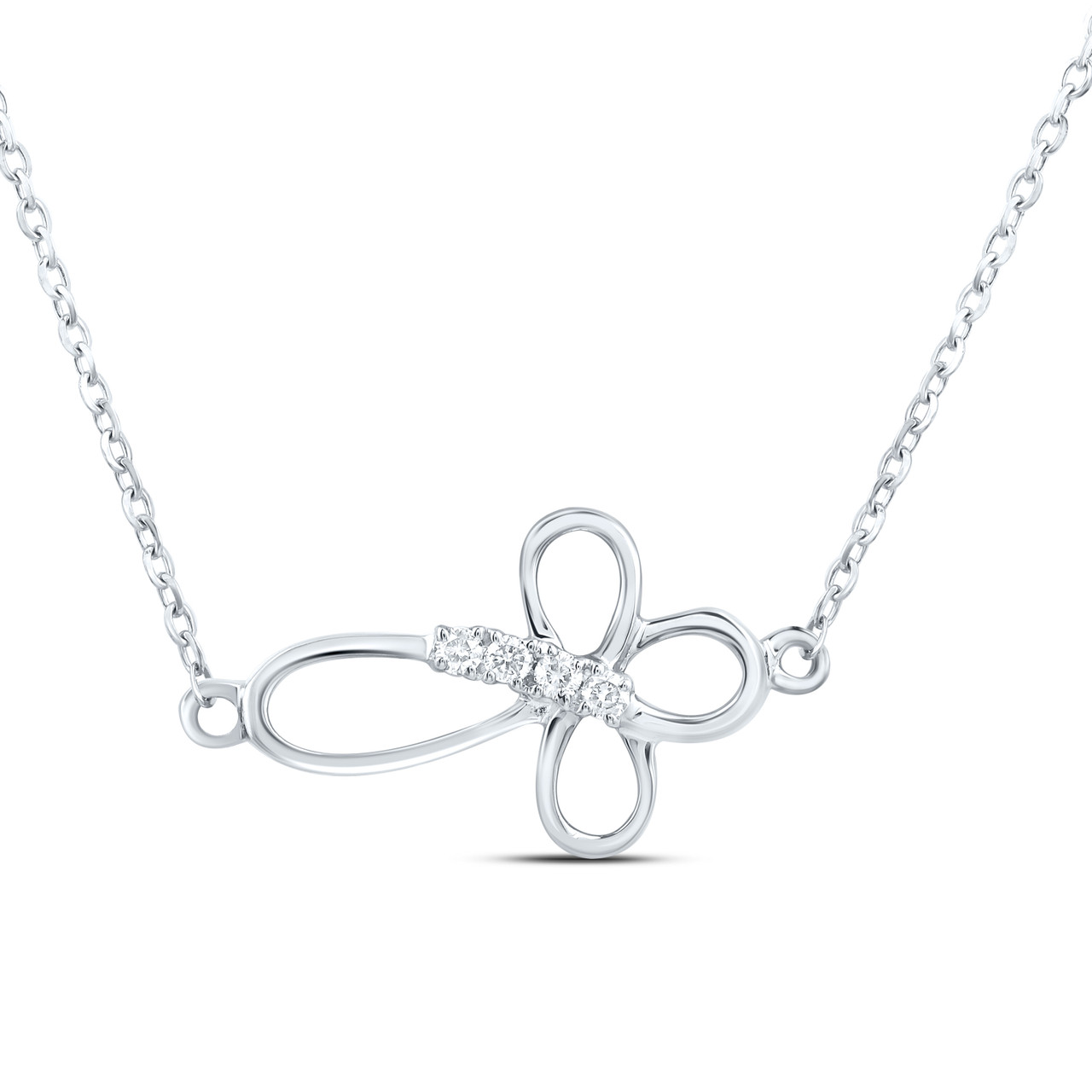 This eye-catching Diamond Sideways Ankh Cross Necklace is crafted in 10k White Gold and shimmering White Diamonds, ensuring sparkle from every angle. Radiant with 0.03 ct. t.w. of Diamonds, this necklace is high-polished to a lustrous shine. Exclusive style has a well built frame to withstand everyday wear and tear. The Diamonds are secured in Prong setting close together, making the overall appearance larger and lustrous. Cable Link chain paired with this necklace set. These are all 100% genuine Round cut Diamonds with matching clarity and color throughout. This necklace measures 18" long and weighs approx. 1.24 gr. This one of a kind piece would make a perfect addition to your jewelry collection.