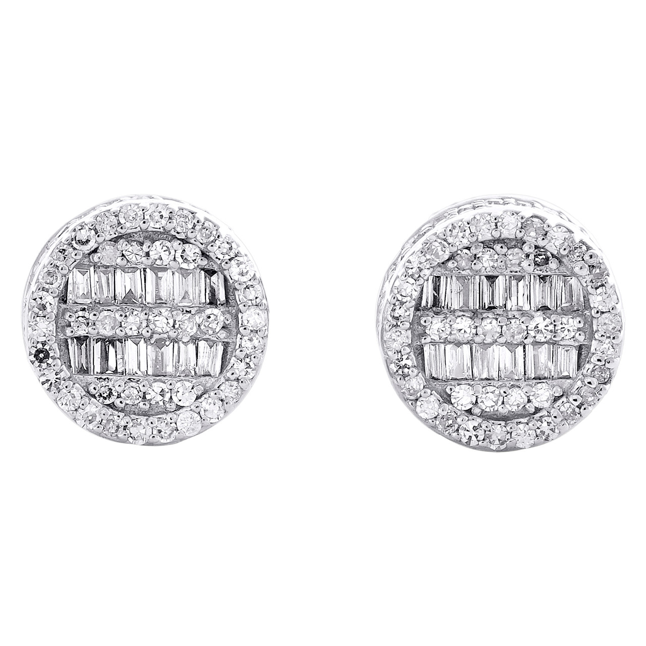 Stunning pair of Studs added to our Rodeo Jewelers earring collection. These Earrings are crafted in solid 10k White Gold. Radiant with 0.55 ct. t.w. of genuine Diamond, these Earrings are high polished for a lustrous shine. These particular Studs consist of genuine Round & Baguette cut White Diamonds in Prong & Invisible Setting, making the overall appearance larger and lustrous. Screw Backs for secure wear, these earrings will make a great gift for any occasion. 3D Round give these earrings depth and makes a bold fashion statement. Good size, these studs are 8mm in width. These Diamond Stud / earrings weigh approx. 2.5 gr.