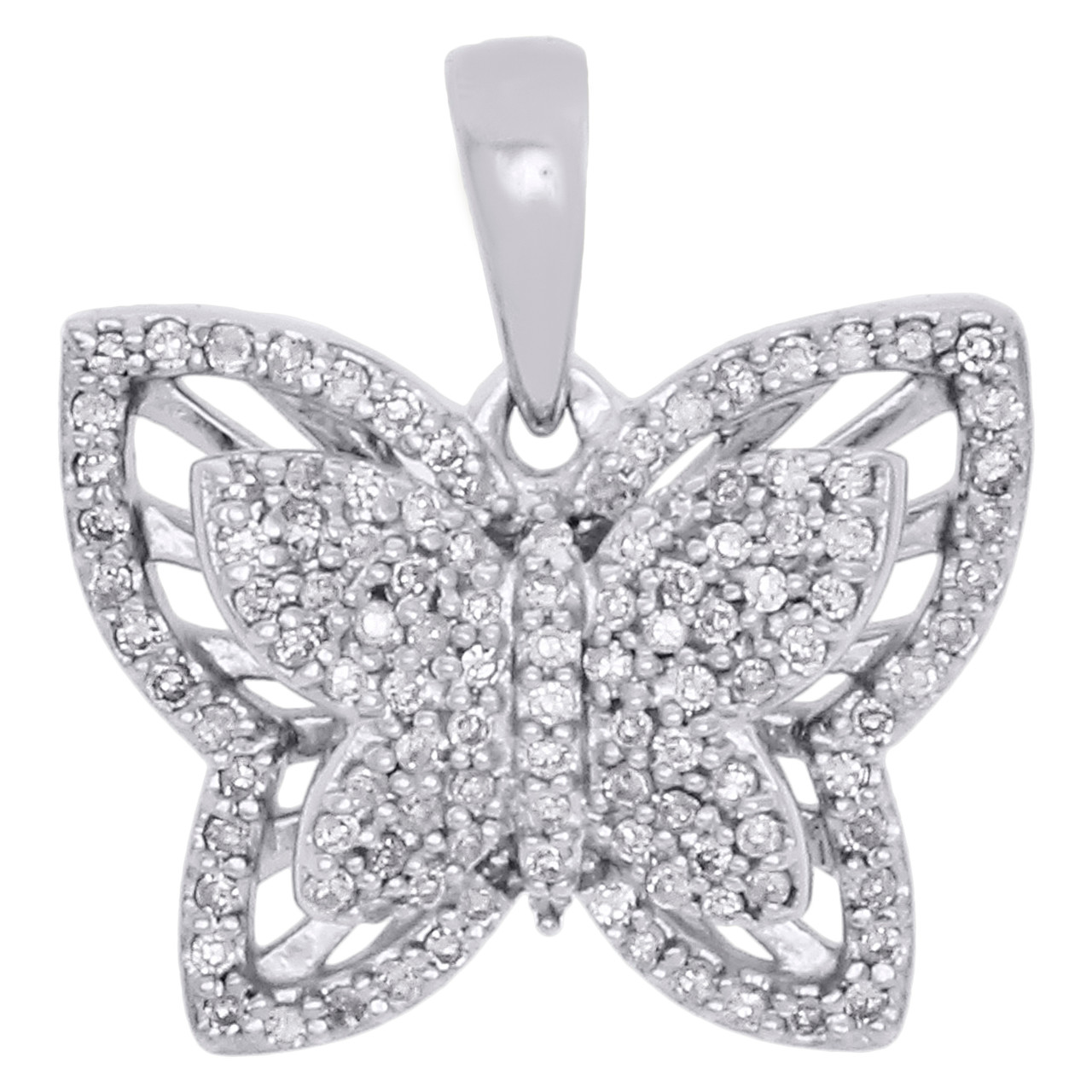 (2.3 gr. of 10K White Gold | Total Carat Weight: 0.25 ct. t.w. of white diamonds | Length: 0.65" | Width: 0.65 | Clarity: I1 - I2 | Color: I - J | Women's Real Genuine Round Diamond Double Frame Butterfly Pendant Fancy Statement Pave Charm)