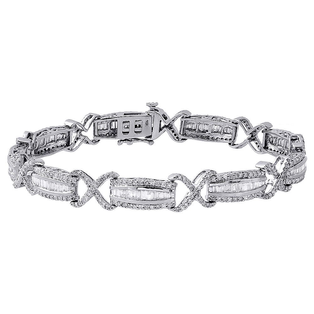 Sophisticated and elegant, new to our Rodeo Jewelers collection is this diamond link bracelet. Casted in real 10K White Gold, it has solid frame all the way around and comfort fitting. All baguette and round cut diamonds are full cut and set in invisible & shared prong setting. Radiant with 3 ct. total weigh of diamonds, this bracelet is polished for a bright shine. Great addition to your jewelry collection with infinity design alternating with traditional look. All the diamonds on this bracelet are of equivalent color and clarity, giving this bracelet a comparable shine and luster throughout. This bracelet has a box-clasp (hidden) with safety latch. This bracelet has genuine white diamonds and weighs approx. 13.1 grams. The width of the mounting holding the round & baguette diamond is 7.75mm wide and 7" length.