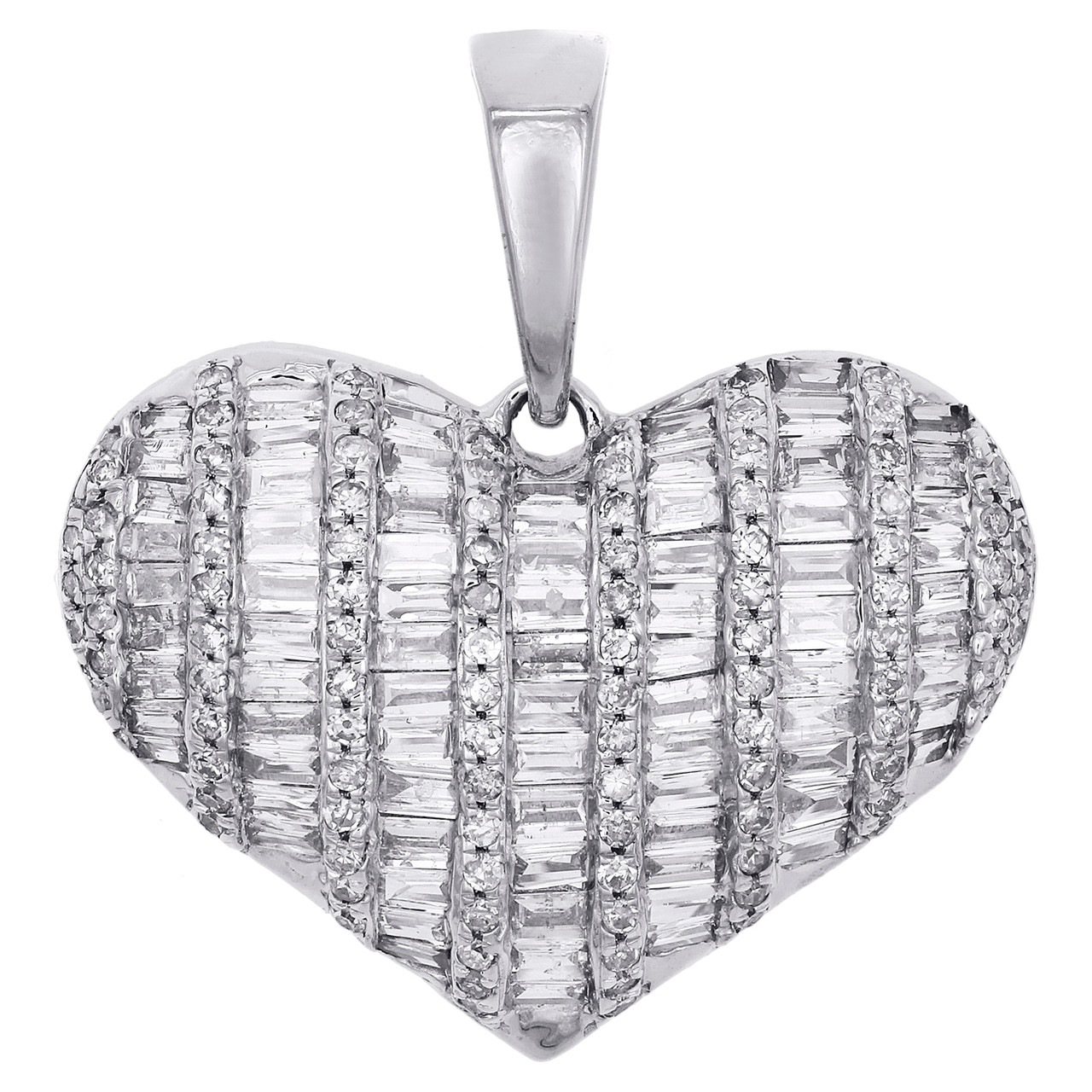 (3.7 gr. of 10K White Gold | Total Carat Weight: 1 ct. t.w. of White Diamonds | Length: 1" (including bail) | Width: 0.90" | Thickness: 7.5mm | Clarity: SI2 - I1 | Color: H - I | Women's Genuine Round & Baguette Diamond Fancy Domed Heart Pendant Statement Charm)