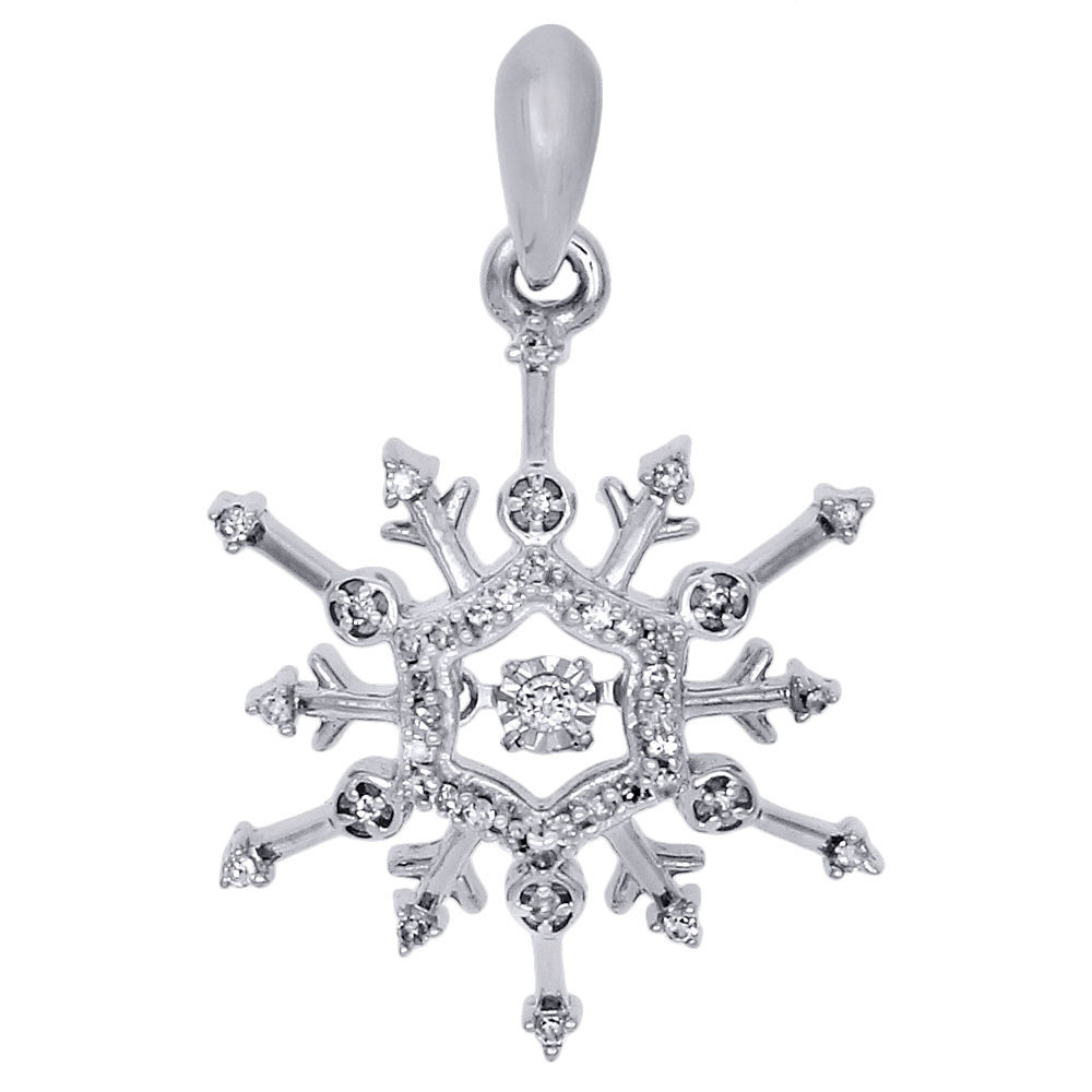 10K White Gold Round Dancing Diamond Snowflake Pendant 1" Long 0.16 CT.