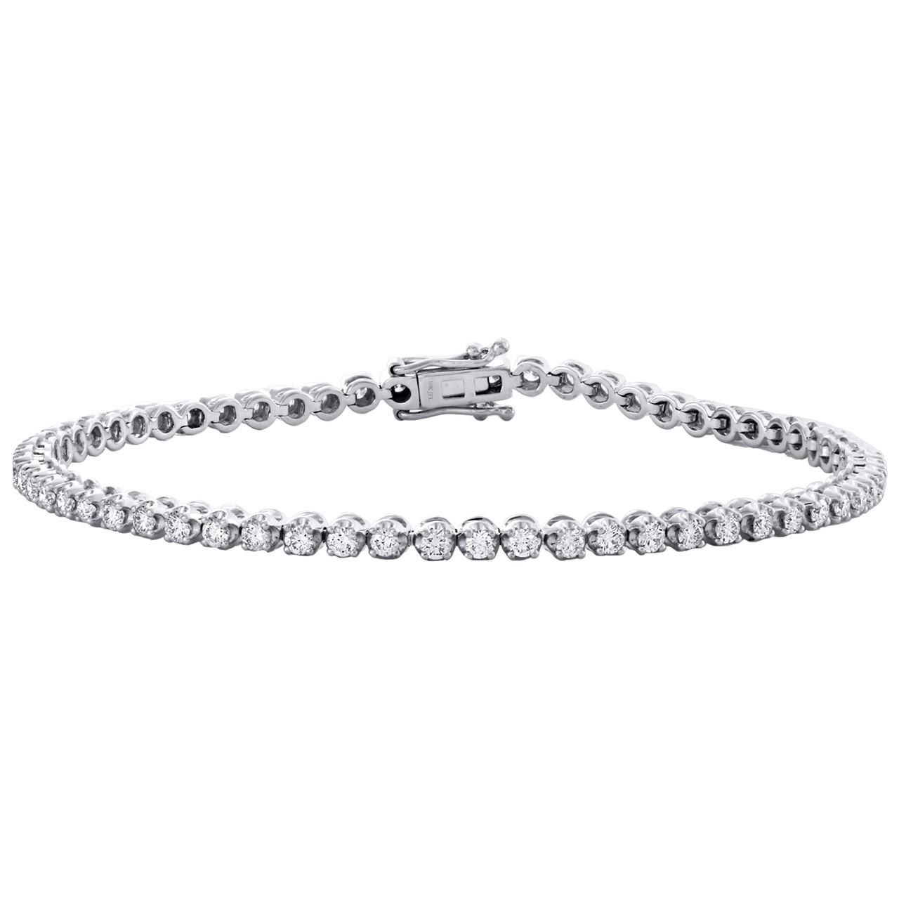 A new sophisticated and classy trend, this Classic Tennis Bracelet features One Row of diamonds in U-Shape 4-Prong Setting. Casted in 10K White Gold, this bracelet features shimmering Full Cut genuine round diamond, a gift she will always treasures. This bracelet is 7" length and 3mm wide frame. The round cut diamonds are Prong Set, making the overall appearance larger and lustrous. Radiant with 2 ct. t.w. of genuine Round Diamonds, and high polished to a bright lustrous shine. Solid 4-Prong U Shape mounting weighs 6.7 gr. All the diamonds in this bracelet are of equivalent color and clarity, giving this bracelet a comparable shine and brilliance throughout. This classic tennis bracelet will be a great addition to her jewelry collection.
