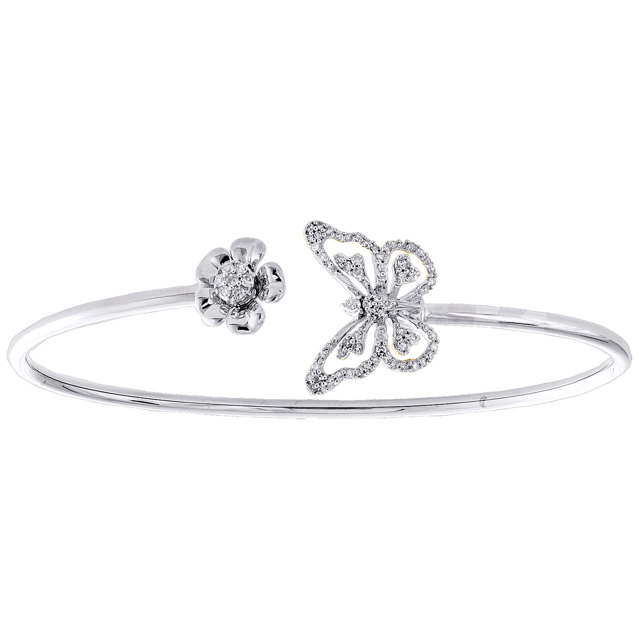 - 10K White Gold Round Diamond Butterfly & Sunflower Bangle Pave Bracelet 1/4 CT.