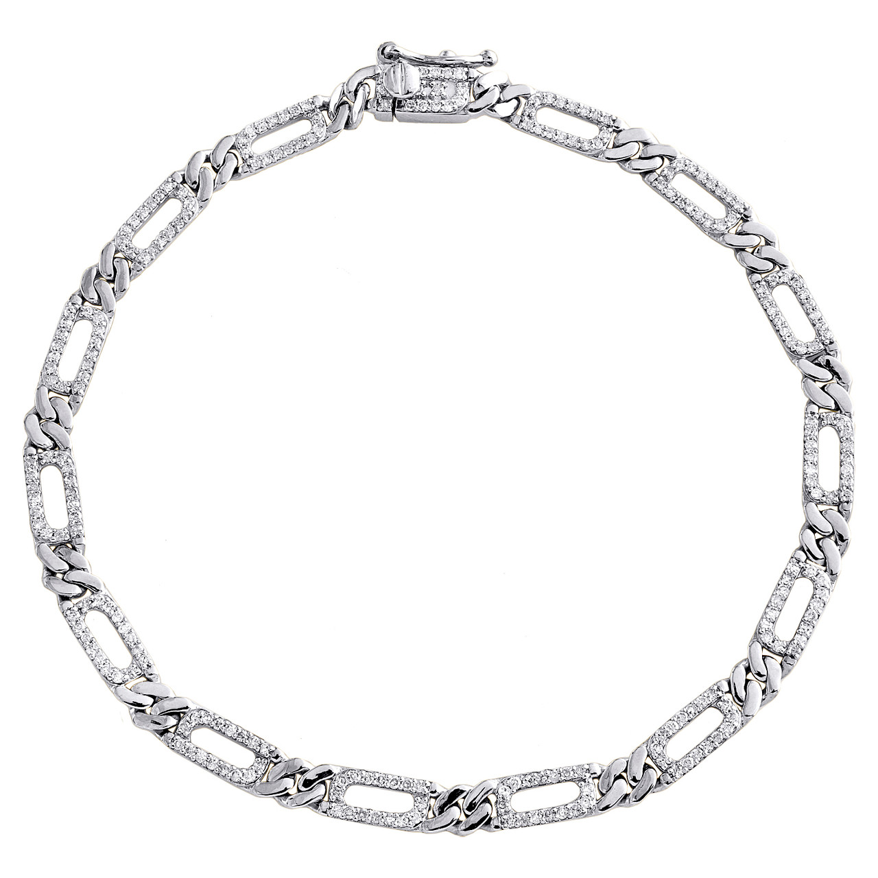 A new sophisticated and elegant look. Crafted in solid 10K White Gold, this Classic Figaro / Cuban Link Statement bracelet is adorned with genuine White diamonds. The diamonds are securely held between the gold mounting in Prong and Pave setting, making the overall appearance larger and lustrous. A meaningful look you'll treasure forever. Radiant with 3/4 ct. t.w. of genuine Round diamonds and polished to a lustrous shine. This bracelet would make a great addition to your jewelry collection. All the diamonds in this bracelet are of equivalent color and clarity, giving this bracelet a comparable shine and luster throughout. This bracelet is secured with Box Clasp with safety latch. Fits up-to 7" wrist size, 4mm wide mounting and weighs 5.1 gr.