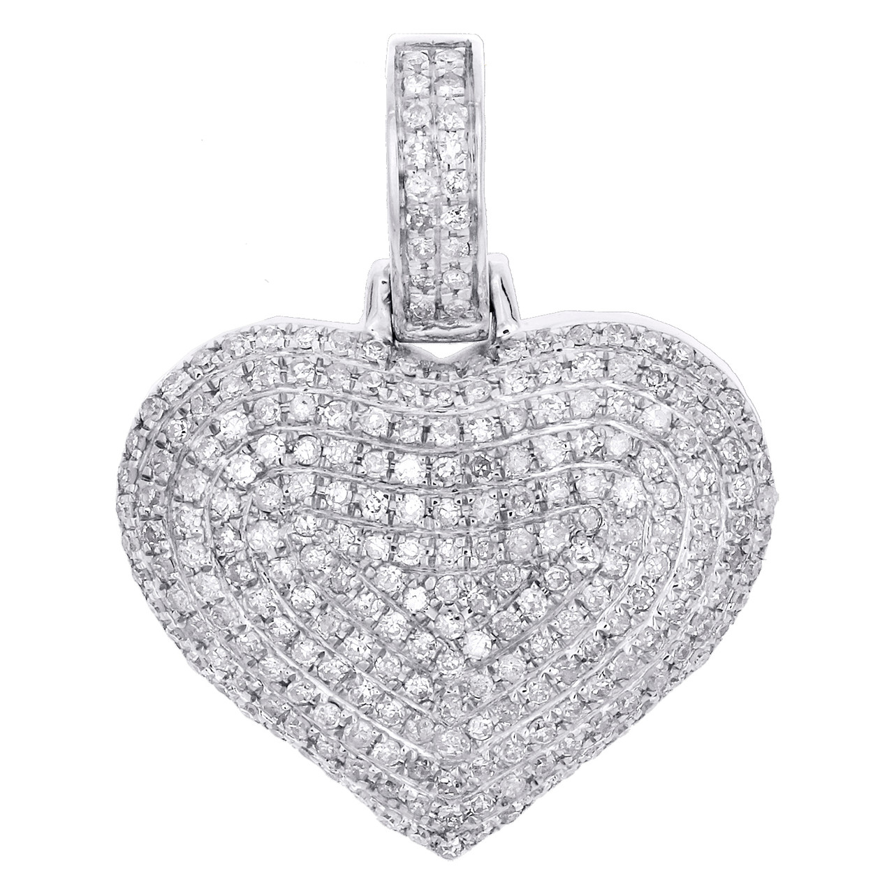 This eye-catching diamond Dome Heart Statement Pendant is casted in solid 10K White Gold and shimmering White diamonds, ensuring sparkle from every angle. Radiant with 3/4 ct. t.w. of diamonds, this pendant is polished to a lustrous shine. Exclusive style has a well built frame with caged back to withstand everyday wear and tear. The diamonds are secured in Prong setting close together, making the overall appearance larger and lustrous. Matching diamond bail to compliment this pendant. These are all 100% genuine Round cut diamonds with matching clarity and color throughout. This pendant measures 1" long and weighs approx. 2.9 gr. This one of a kind piece would make a perfect addition to your jewelry collection.