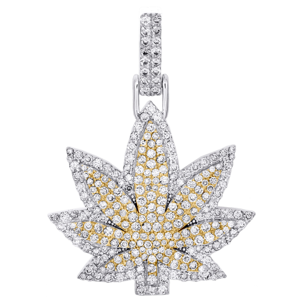 (7 gr. of 10K Two Tone Gold | Total Carat Weight: 1.90 ct. t.w. of White Diamonds | Length: 1.50" (Including Bail) | Width: 1.50" | Clarity: SI2 - I1 | Color: H - I | Men's Genuine Round Diamond Two Tone Layered Marijuana Leaf Hemp Pendant Statement Pave Charm)
