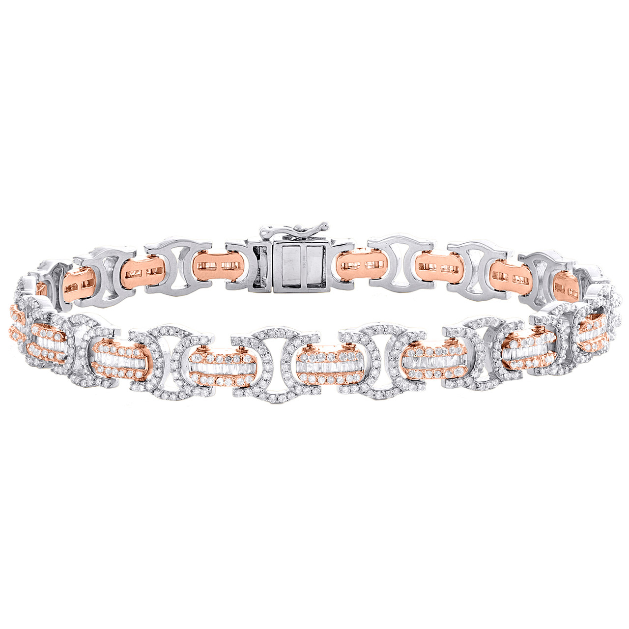 10K White & Rose Gold Round & Baguette Diamond 9mm Statement Bracelet 3.75 CT.