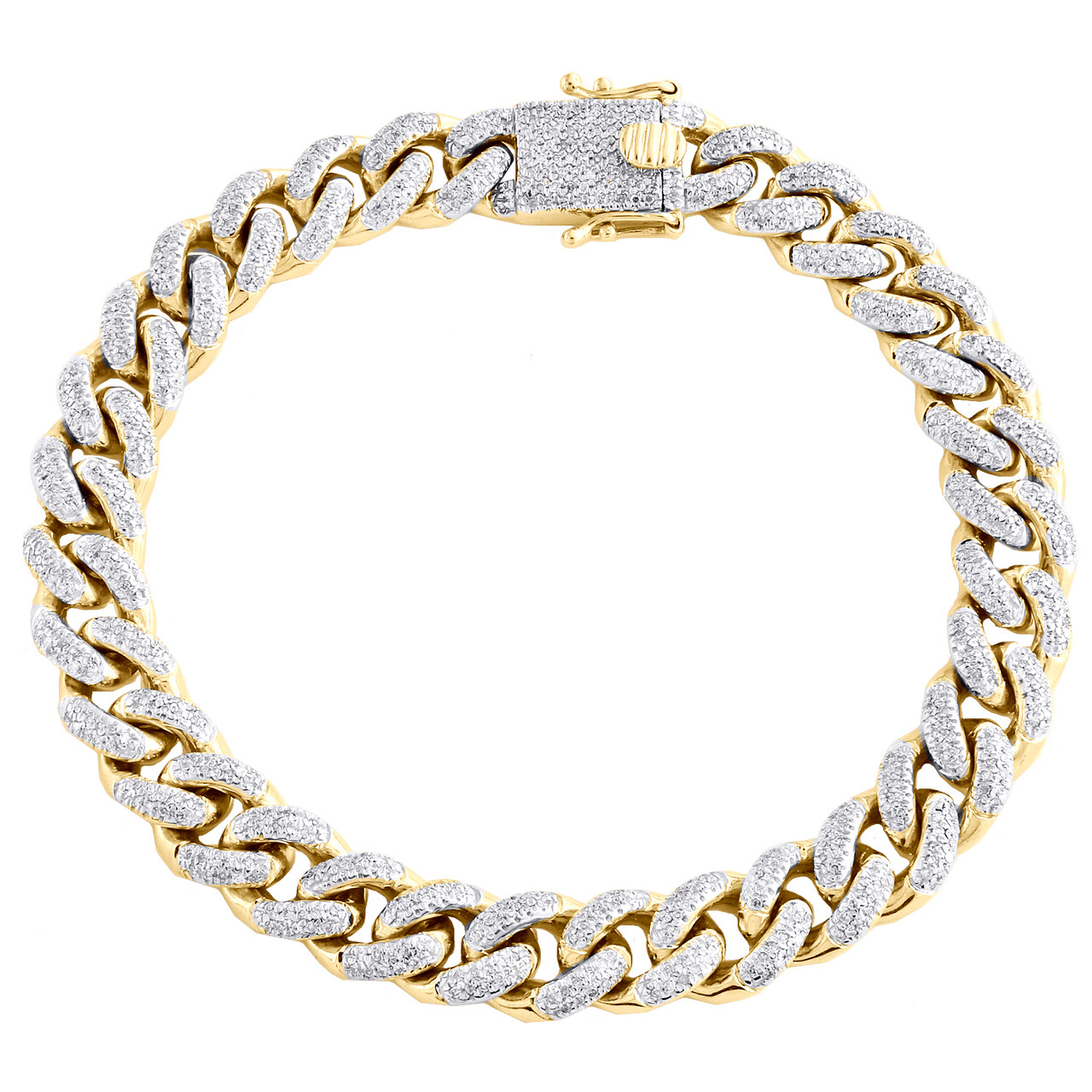 (40 gr. of 10K Yellow Gold | Total Carat Weight: 2 ct. t.w. of White Diamonds | Length: 8.75" | Width: 9.50mm | Clarity: SI2 - I1 | Color: H - I | Men's Genuine Round Diamond Miami Cuban Link 9.50mm Frame Statement Bracelet with Box Clasp)