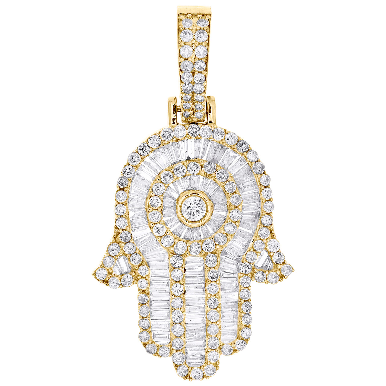 This eye-catching diamond Hamsa Hand is crafted in solid 10k Yellow Gold and shimmering White diamonds, ensuring sparkle from every angle. Radiant with 1.90 ct.. t.w. of diamonds, this pendant is polished to a lustrous shine. Exclusive style has a well built frame with a Caged back to withstand everyday wear and tear. The diamonds are secured in Prong, Channel, Bezel setting close together, making the overall appearance larger and lustrous. These are all 100% genuine Round, Baguette cut diamonds with matching clarity and color throughout. This Hamsa Hand Pendant measures 1.40" (incluiding bail) long and weighs approx. 4.6 gr. This style would make a perfect addition to your jewelry collection.