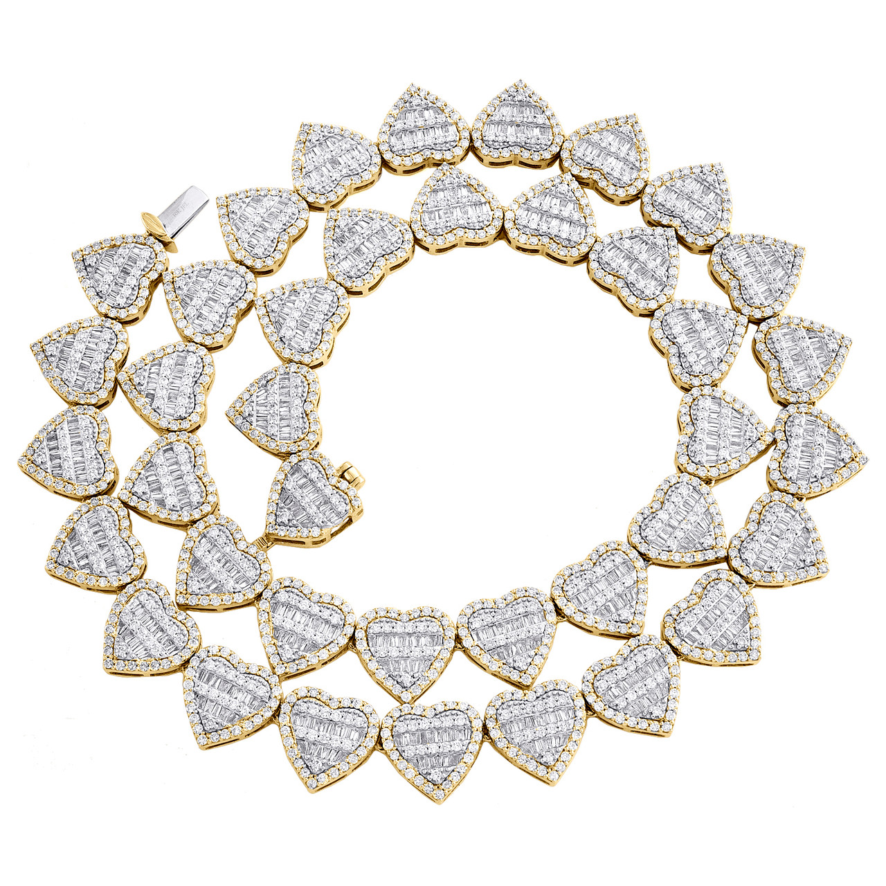 (60.9 gr. of 10k Yellow Gold | Total Carat Weight: 15 Ct. t.w. of White Diamonds | Length: 18" | Width: 11.5mm | Clarity: VS2 - SI1 | Color: G - H| Genuine Baguette & Round Diamond Heart Link Link Necklace Statement Chain)