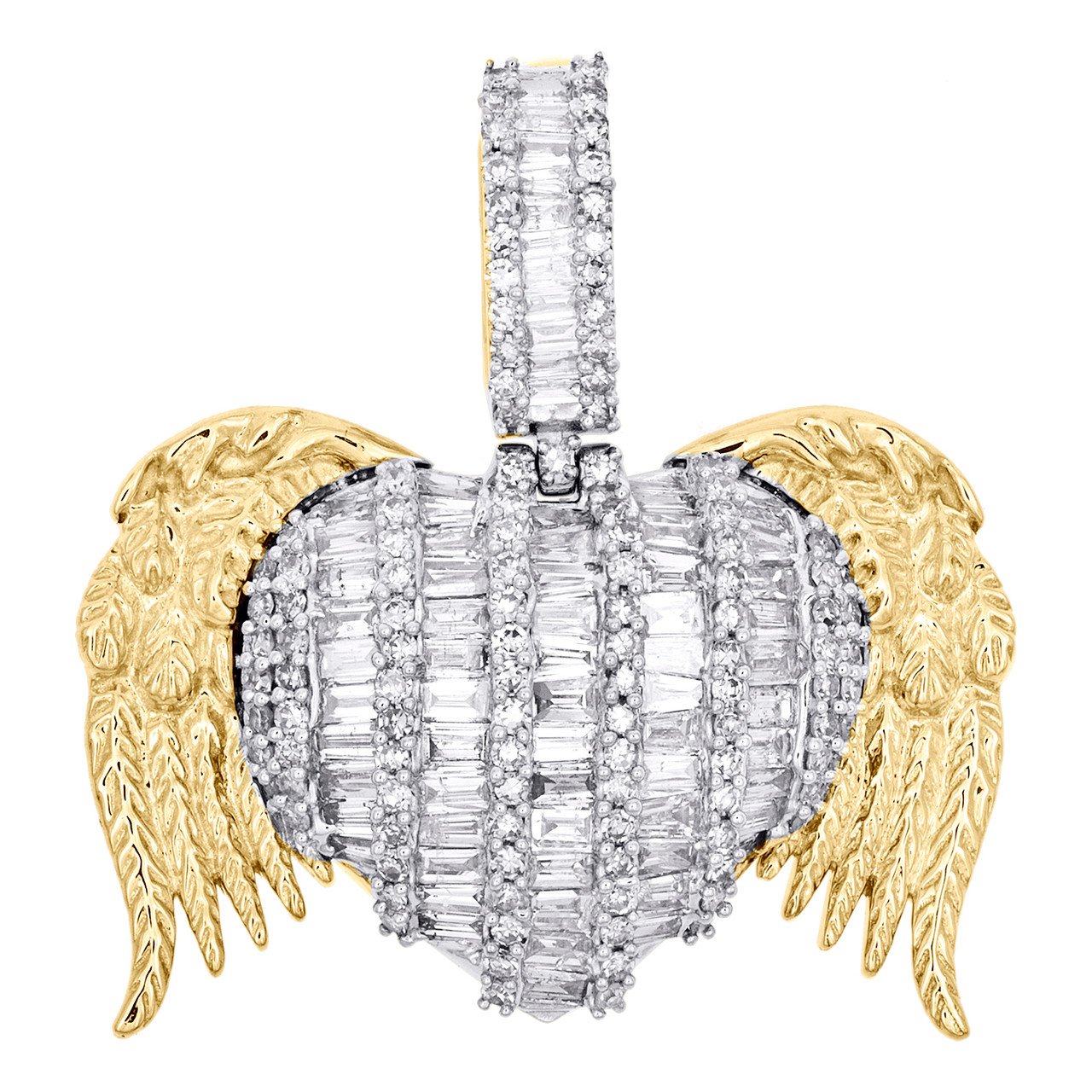 This eye-catching diamond "Domed Heart with Angel Wigns Statement Pendant is crafted in solid 10K Yellow Gold and shimmering White diamonds, ensuring sparkle from every angle. Radiant with 2 ct. t.w. of diamonds, this pendant is polished to a lustrous shine. Exclusive style has a well built frame with caged back to withstand everyday wear and tear. The diamonds are secured in Prong and Channel setting close together, making the overall appearance larger and lustrous. Exclusive diamond bail to compliment this pendant. These are all 100% genuine Round and Baguette cut diamonds with matching clarity and color throughout. This pendant measures 1.15" long and weighs approx. 7.3 gr. This one of a kind piece would make a perfect addition to your jewelry collection.