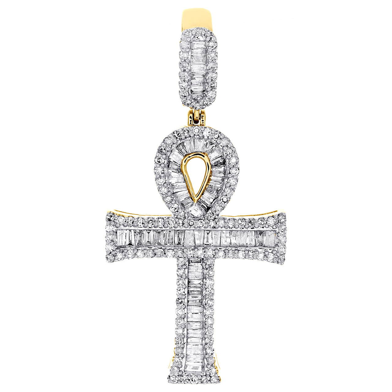 - 10K Yellow Gold Baguette Diamond Egyptian Ankh Cross Pendant 1.5" Charm 7/8 CT.