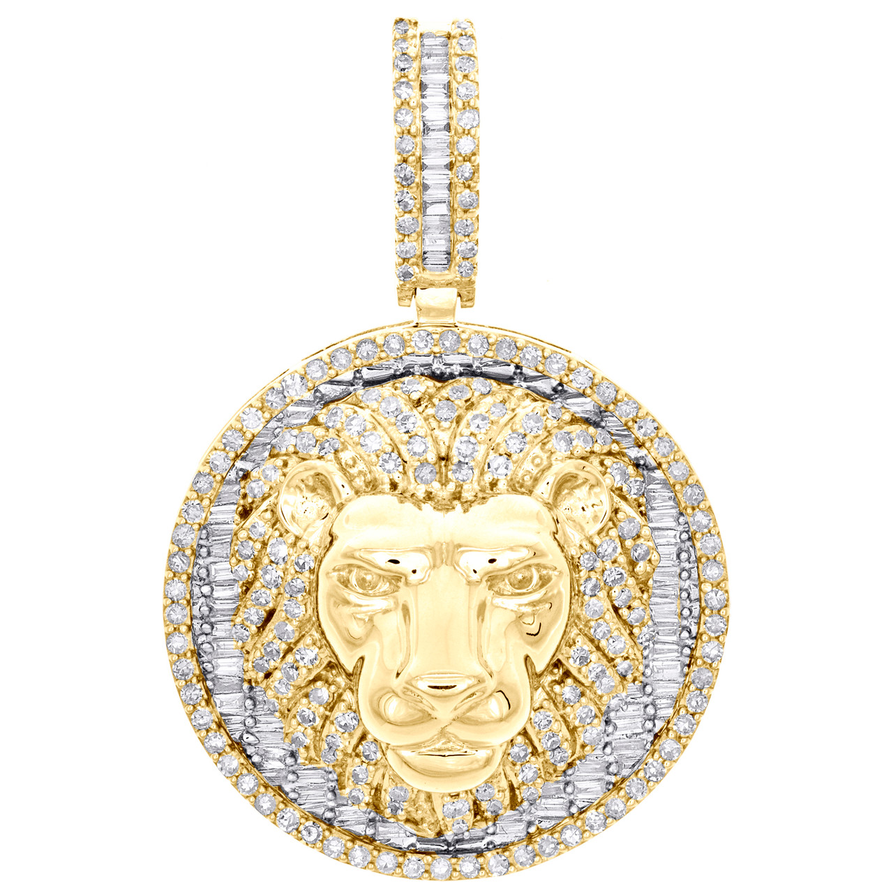 (12.3 gr. of 10K Yellow Gold | Total Carat Weight: 1.85 ct. t.w. of White Diamonds | Length: 1.65" (including bail) | Width: 1.05" | Thickness: 15mm | Clarity: SI2 - I1 | Color: H - I | Men's Round and Baguette Cut Diamond Lion Head Medallion Statement Pendant Fancy Charm)