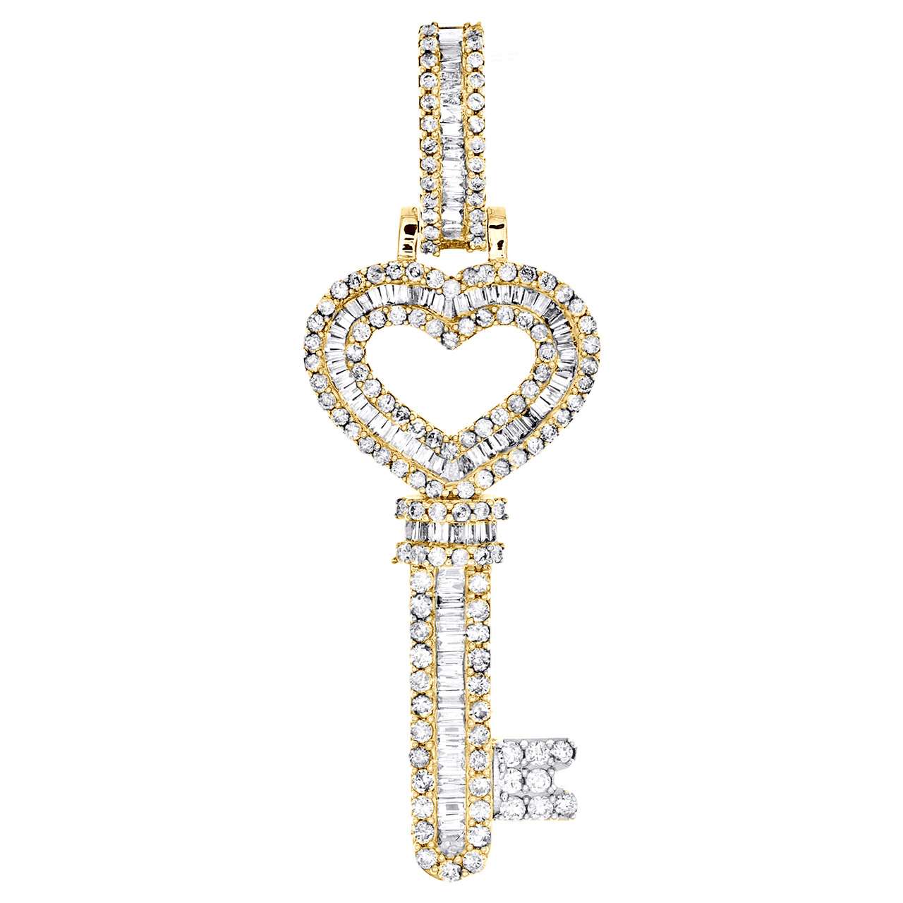 - 10K Yellow Gold Baguette Diamond Love Heart Key Pendant 1.95" Charm 1.40 CT.