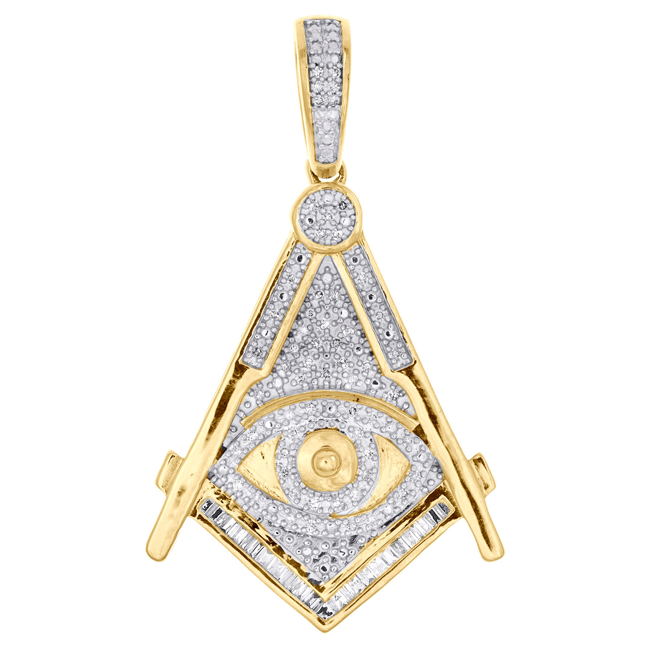- 10K Yellow Gold Baguette Diamond Men's Masonic Compass Evil Eye Pendant 1/5 CT