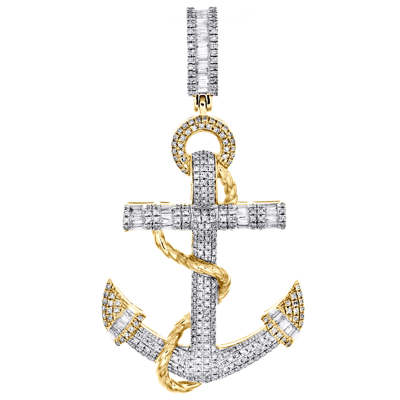 (6.8 gr. of 10K Yellow Gold | Total Carat Weight: 0.95 ct. t.w. of White Diamonds | Length: 2" (Including Bail) | Width: 1" | Thickness: 5mm | Clarity: I1 - I2 | Color: H - I | Mens Genuine Round & Baguette Diamond Anchor Pendant Statement Charm)