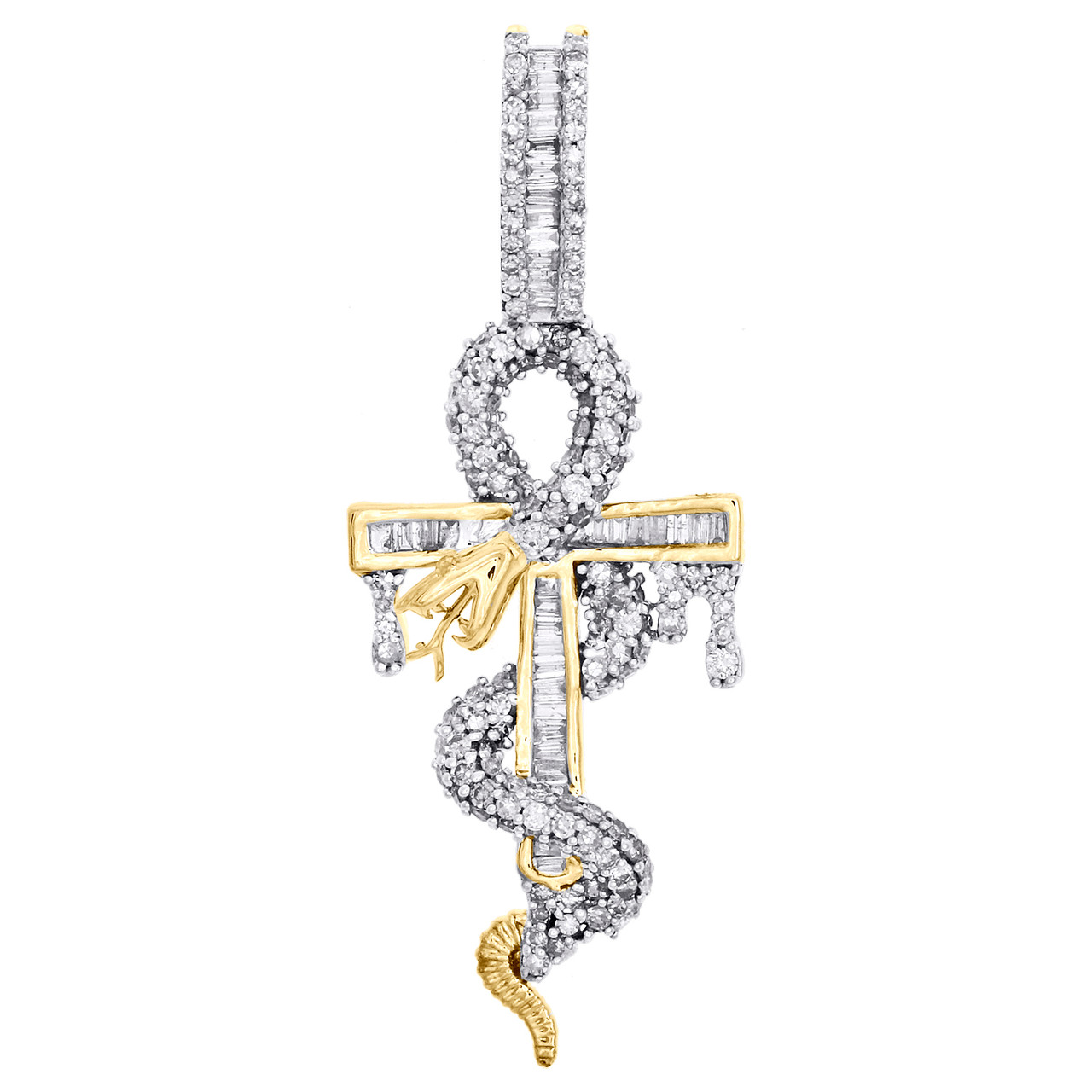 This eye-catching diamond Snake Ankh Cross Pendant is casted in solid 10K Yellow Gold and shimmering White diamonds, ensuring sparkle from every angle. Radiant with 1.20 ct. t.w. of diamonds, this pendant is polished to a lustrous shine. Exclusive style has a well built frame to withstand everyday wear and tear. The diamonds are secured in Prong and Channel setting close together, making the overall appearance larger and lustrous. Matching diamond bail to compliment this pendant. These are all 100% genuine Round and Baguette cut diamonds with matching clarity and color throughout. This pendant measures 1.85" long and weighs approx. 4.8 gr. This one of a kind piece would make a perfect addition to your jewelry collection.