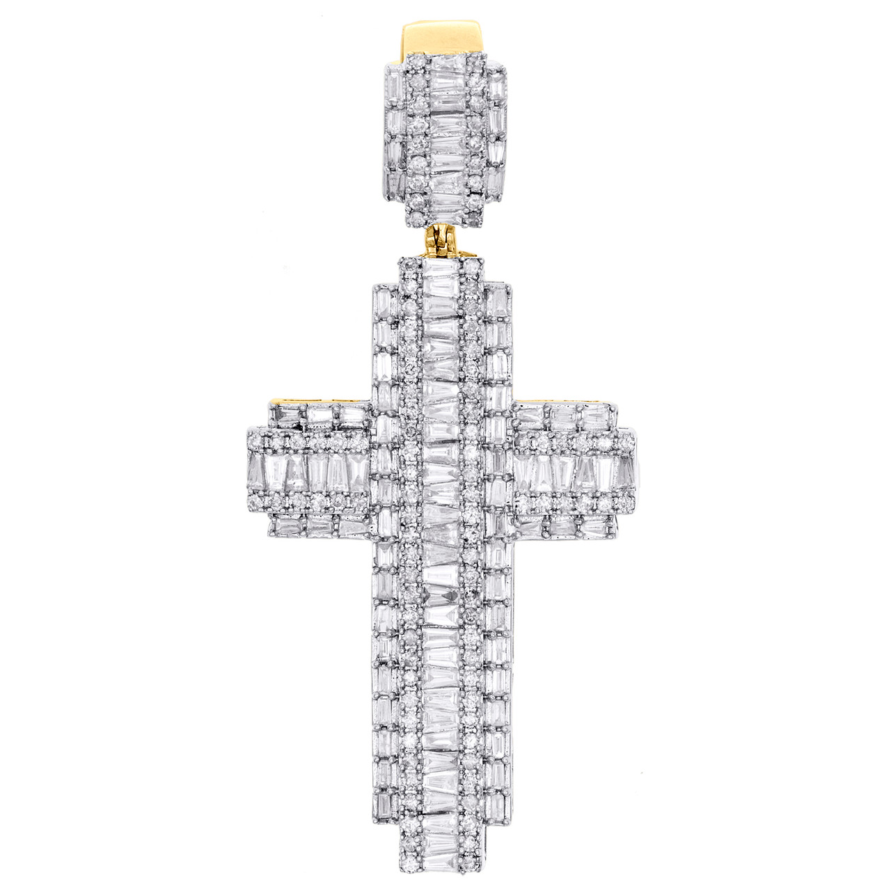 (10.5 gr. of 10K Yellow Gold | Total Carat Weight: 3.20 ct. t.w. of White Diamonds | Length: 2.40" (including bail) | Width: 1.10" | Thickness: 4mm | Clarity: SI2 - I1 | Color: H - I | Men's Round and Baguette Cut Diamond Tiered Religious Wide Frame Fancy Cross Pendant Statement Charm)