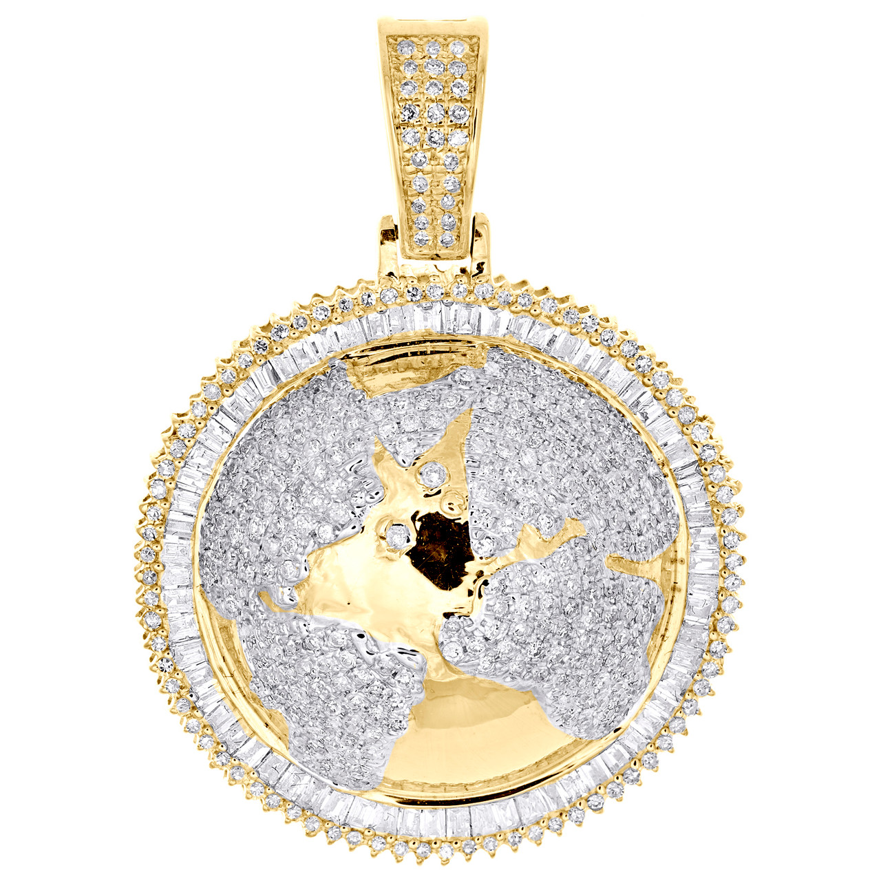 (6.3 gr. of 10K Yellow Gold | Total Carat Weight: 1.35 ct. t.w. of White Diamonds | Length: 1.40" (Including Bail) | Width: 1" | Thickness: 9mm | Clarity: I1 - I2 | Color: H - I | Mens Genuine Round & Baguette Diamond 3D Domed World Map Medallion Pendant Statement Charm)