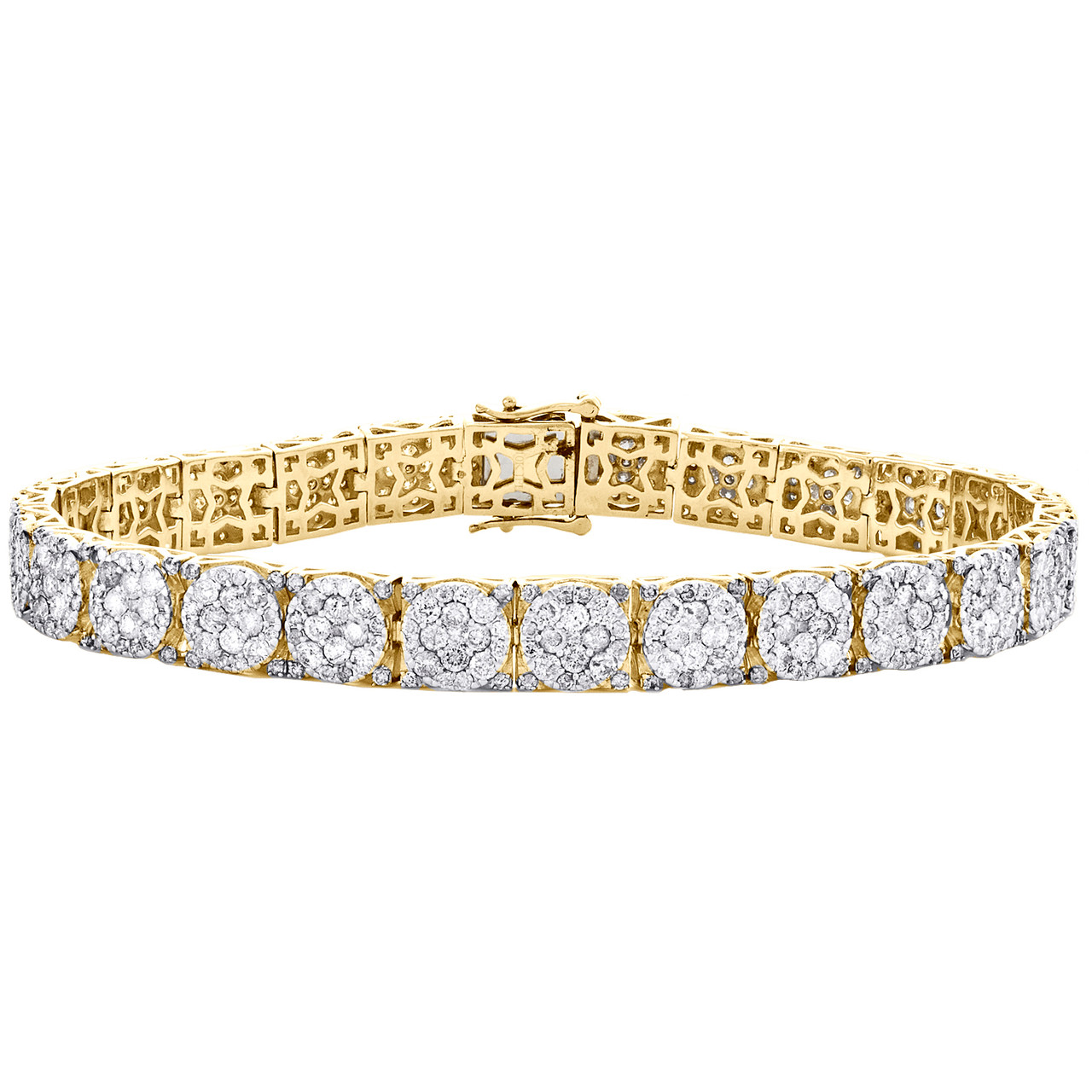 (28 gr. of 10K Yellow Gold | Total Carat Weight: 10.17 ct. t.w. of White Diamonds | Length: 8.75" | Width: 8mm | Clarity: SI1 - SI3 | Color: H - I | Men's Genuine Round Diamond 4 Prong Cluster Frame Fancy Statement Bracelet)