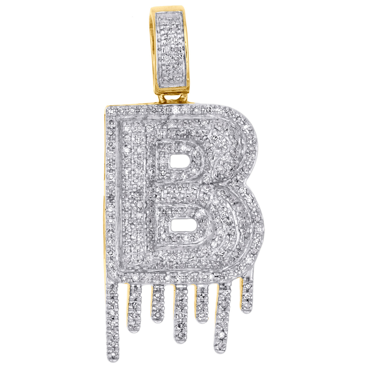 (5.0 gr. of 10K Yellow Gold | Total Carat Weight: 0.62 ct. t.w. of White Diamonds | Length: 1.50" (including bail) | Width: 0.65" | Clarity: I1 - I2 | Color: H - I | Unisex Genuine Diamond "B" Initial Drip Pendant Bubble Letter Pave Charm)