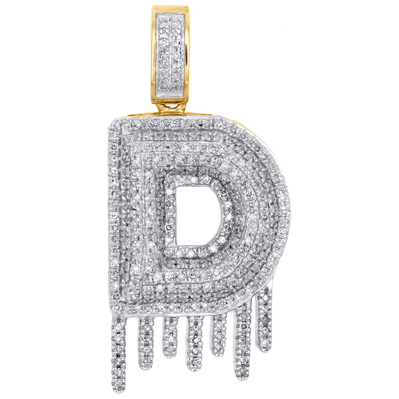 (5.2 gr. of 10K Yellow Gold | Total Carat Weight: 0.75 ct. t.w. of White Diamonds | Length: 1.45" (including bail) | Width: 0.70" | Clarity: I1 - I2 | Color: H - I | Unisex Genuine Diamond "D" Initial Drip Pendant Bubble Letter Pave Charm)