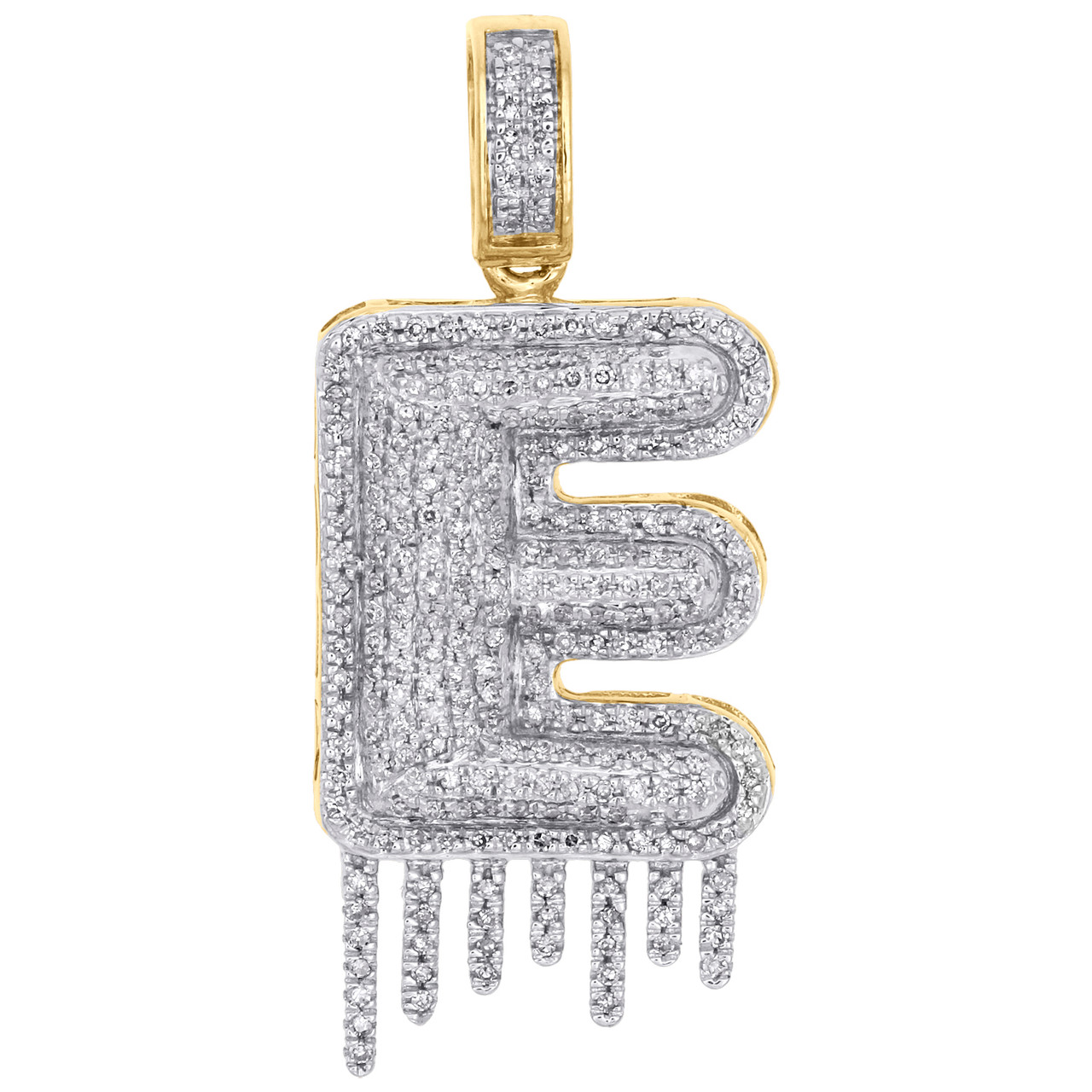 (6.0 gr. of 10K Yellow Gold | Total Carat Weight: 0.75 ct. t.w. of White Diamonds | Length: 1.55" (including bail) | Width: 0.70" | Clarity: I1 - I2 | Color: H - I | Unisex Genuine Diamond "E" Initial Drip Pendant Bubble Letter Pave Charm)