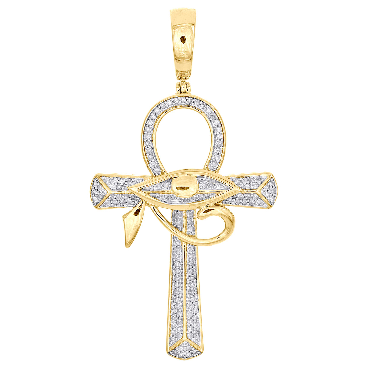 (5.3 gr. of 10k Yellow Gold | Total Carat Weight: 0.33 ct. t.w. of White Diamonds | Length: 2" (including bail) | Width: 1" | Clarity: SI2 - I1 | Color: H - I | Men's Genuine Round Diamond Eye of Ra | Ankh Cross Pendant Religious Charm)