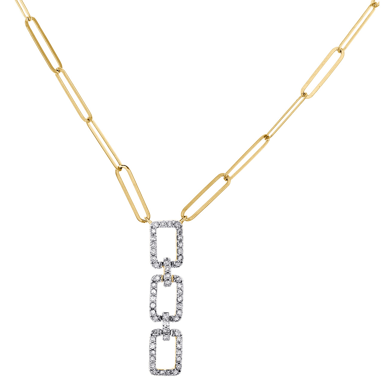 (3.7 gr. of 10K Yellow Gold | Total Carat Weight: 0.25 ct. t.w. of White Diamonds | Necklace Length: 18" | Necklace Width: 2.50mm | Charm Length: 1" | Charm Width: 0.20" | Thickness: 3mm | Clarity: I1 - I2 | Color: H - I | Women's Natural Round Diamond Square Dangle Frame Cable / Paper Clip Link Statement Necklace)