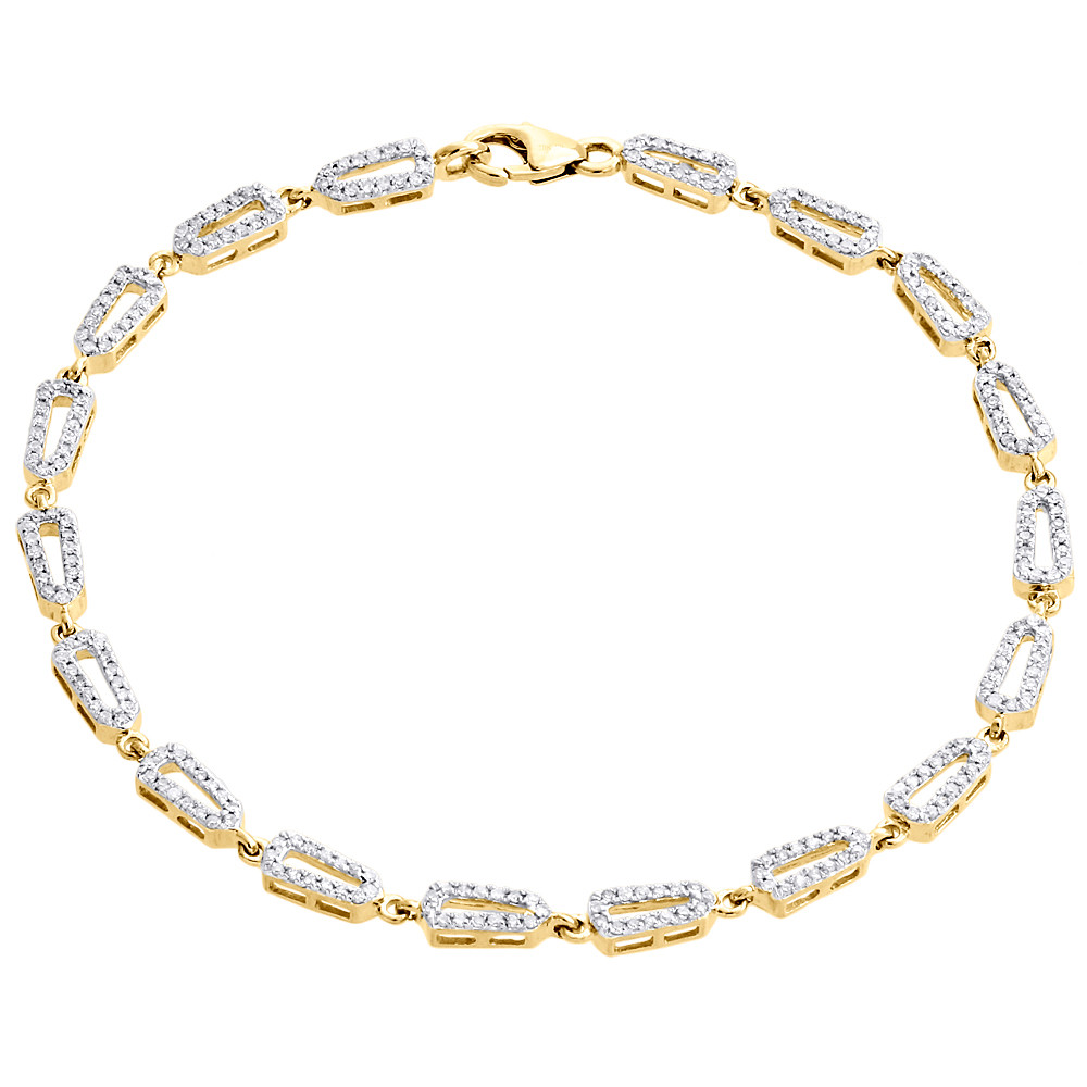 A new sophisticated and ?classy style, this ?fancy frame statement bracelet ?has just a hint of subtle sparkle?. ?Crafted in solid 10K Yellow ?Gol??d with? shimmering round diamond, a gift she will always treasures. Clever design pairs gracefully with round cut diamonds, a look that captures the eye. The round cut diamonds are set in pave setting, making the overall appearance larger and lustrous. Radiant with ?3/4 ct. t.w. of genuine diamonds and high polished to a bright lustrous finish. All the diamonds in this bracelet are of equivalent color and clarity, giving this bracelet a comparable shine and luster throughout.? This trendy bracelet weighs 5.2 gr. and measures 7.50 inches long and 3.75mm wide.