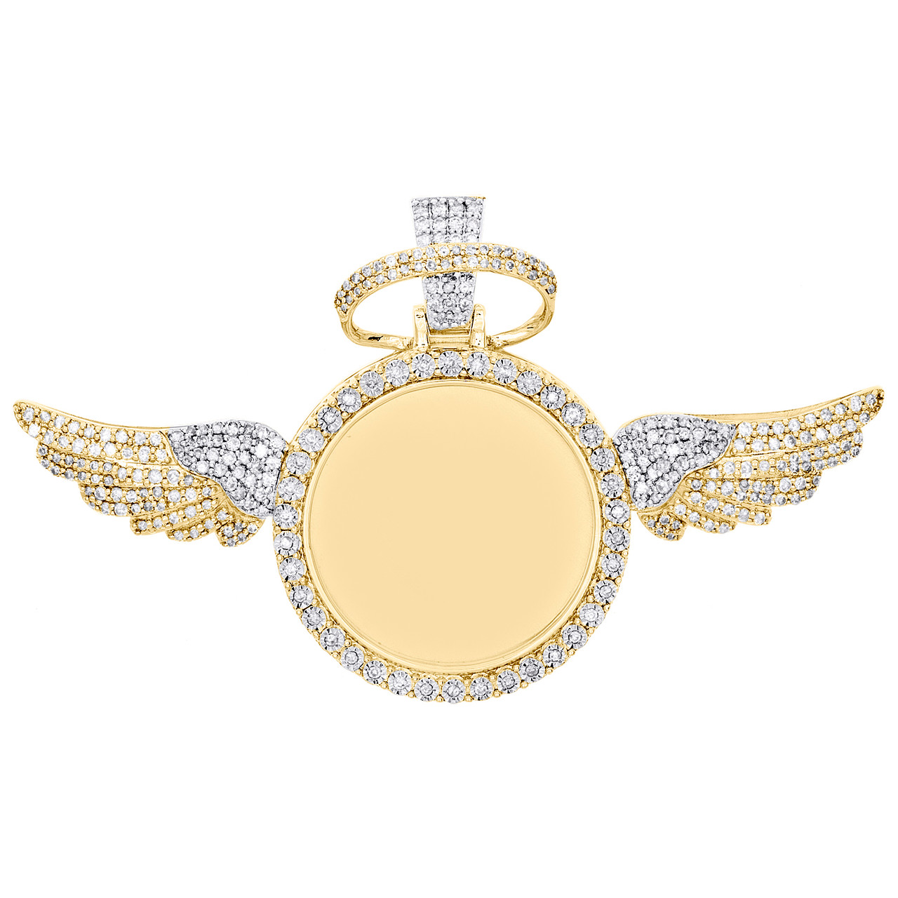 (18.6 gr. of 10K Yellow Gold | Total Carat Weight: 2.30 ct. t.w. of White Diamonds | Length: 1.85" (including bail) | Width: 3.15" | Thickness: 5mm | Clarity: SI2 - I1 | Color: H - I | Men's Genuine Round Diamond Memory Picture Frame Pendant with Angel Wings Statement Charm)
