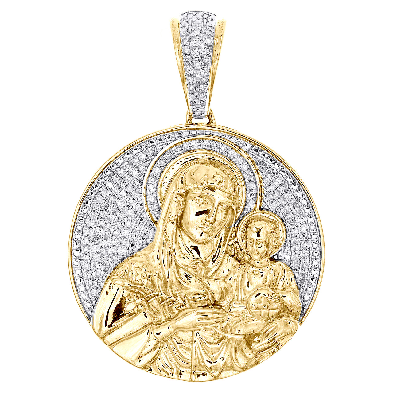 (5.4 gr. of 10k Yellow Gold | Total Carat Weight: 0.25 ct. t.w. of White Diamonds | Length: 1.50" (including bail) | Width: 1" | Clarity: SI2 - I1 | Color: H - I | Men's Genuine Round Diamond Mother Mary & Baby Jesus Pendant Statement Medal)