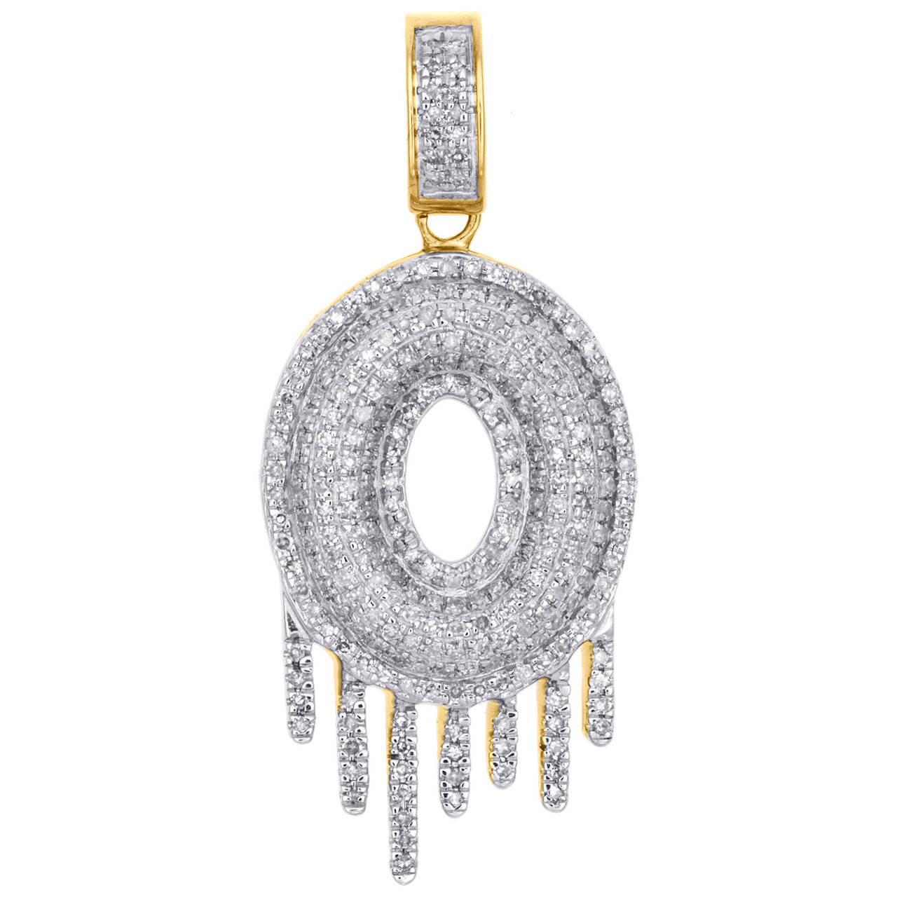 (4.3 gr. of 10K Yellow Gold | Total Carat Weight: 0.75 ct. t.w. of White Diamonds | Length: 1.60" (including bail) | Width: 0.70" | Clarity: I1 - I2 | Color: H - I | Unisex Genuine Diamond "O" Initial Drip Pendant Bubble Letter Pave Charm)